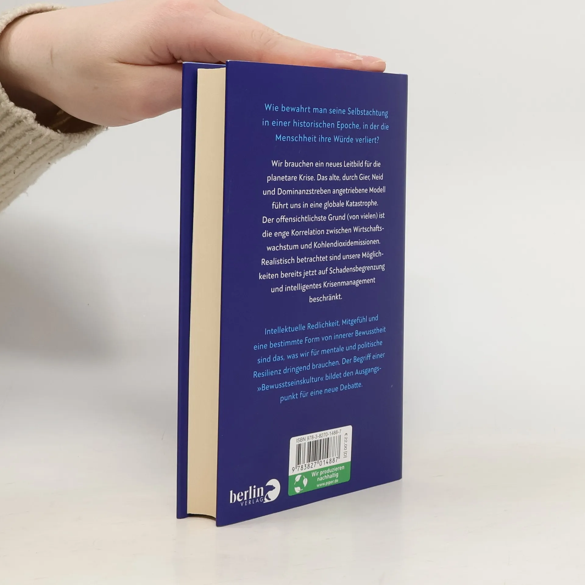 Wie bewahrt man seine Selbstachtung in einer Zeit, in der die Menschheit ihre Würde verliert? Ein neues Leitbild ist nötig, um der planetaren Krise zu begegnen. Das alte Modell des kontinuierlichen Wirtschaftswachstums, geprägt von Gier und Dominanzstreben, führt uns in eine globale Katastrophe, da Wachstum eng mit Kohlendioxidemissionen korreliert ist. Wir müssen uns der Realität stellen: Unsere Möglichkeiten sind auf Schadensbegrenzung und intelligentes Krisenmanagement beschränkt. Intellektuelle Redlichkeit, Mitgefühl und innere Bewusstheit sind entscheidend für mentale und politische Resilienz. Der Begriff der „Bewusstseinskultur“ eröffnet eine neue Debatte über Mitgefühl und radikale Selbstachtung. Über dreißig Jahre haben wir versagt, was maßgeblich auf einen Mangel an kultureller Kreativität zurückzuführen ist. Wir müssen alte Werte hinter uns lassen und neue Leitbilder schaffen, um einen kulturellen Kontext für den Ausstieg aus dem Wachstumsmodell zu entwickeln. Eine Bewusstseinskultur ist notwendig, die sowohl individuell als auch gesellschaftlich funktioniert. Viele haben wenig Mitgefühl für zukünftige Generationen, was dazu führt, dass wir uns selbst nicht mehr ernst nehmen können. Die Klimakatastrophe wird unser Gefühl der Würde weiter untergraben. Es ist dringend erforderlich, eine radikale neue Bewusstseinskultur zu etablieren.