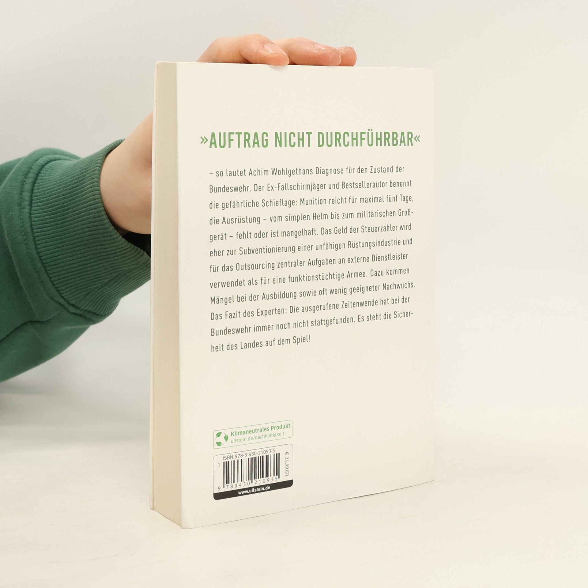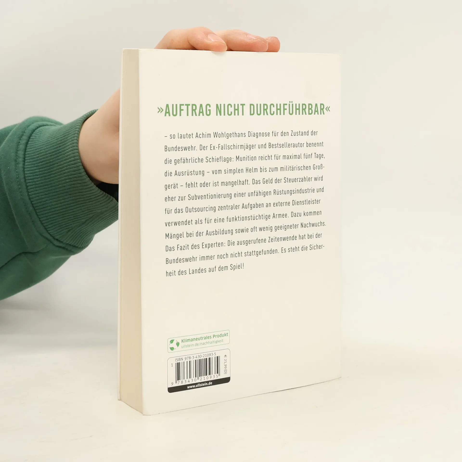 Der Ex-Fallschirmjäger Achim Wohlgethan ist als Mitarbeiter im Außendienst für den Deutschen Bundeswehrverband nahezu täglich in halb Deutschland an Liegenschaften der Bundeswehr im Einsatz. Er kennt die Sorgen und Nöte der Soldatinnen und Soldaten, die Probleme, Mängel, verkrusteten Strukturen und politischen Fehler aus erster Hand. Seine Analyse zeigt, was in der Truppe und den einzelnen Einsatzbereichen, der Führungskultur und beim Commitment der Politik im Argen liegt und warum wir uns mit dieser Bundeswehr nicht sicher und gut verteidigt fühlen können. 100 Milliarden sind ein Tropfen auf den heißen Stein – zumal die Herausforderungen der neuen Bedrohungslage sowie die internationalen Aufgaben innerhalb der NATO die Bundeswehr künftig immer stärker fordern werden. Achim Wohlgethan beschreibt das Versagen der Politik und bei der Nachwuchsgewinnung sowie den katastrophalen Umgang mit Veteranen. Er berechnet die wahren Kosten für eine einsatzfähige Bundeswehr und gibt der Politik eine konstruktive To-do-Liste an die Hand.