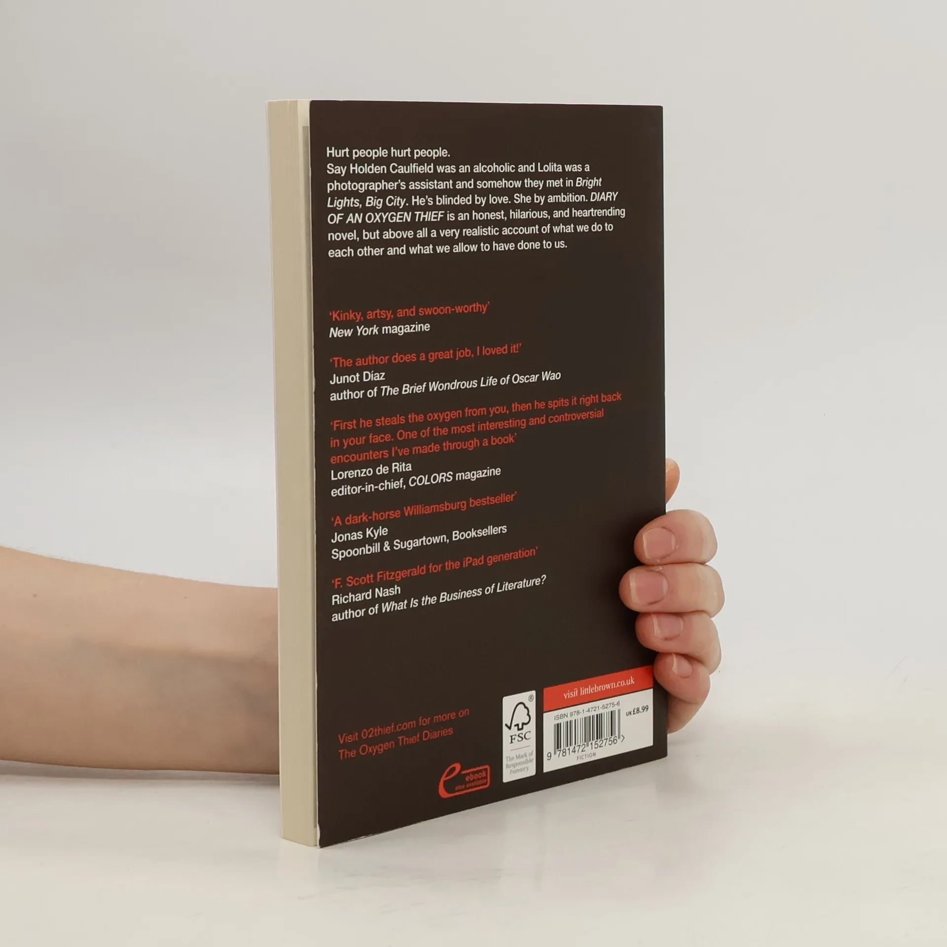 Hurt people hurt people. Say there was a novel in which Holden Caulfield was an alcoholic and Lolita was a photographer's assistant and, somehow, they met in Bright Lights, Big City. He's blinded by love. She by ambition. Diary of an Oxygen Thief is an honest, hilarious, and heartrending novel, but above all, a very realistic account of what we do to each other and what we allow to have done to us