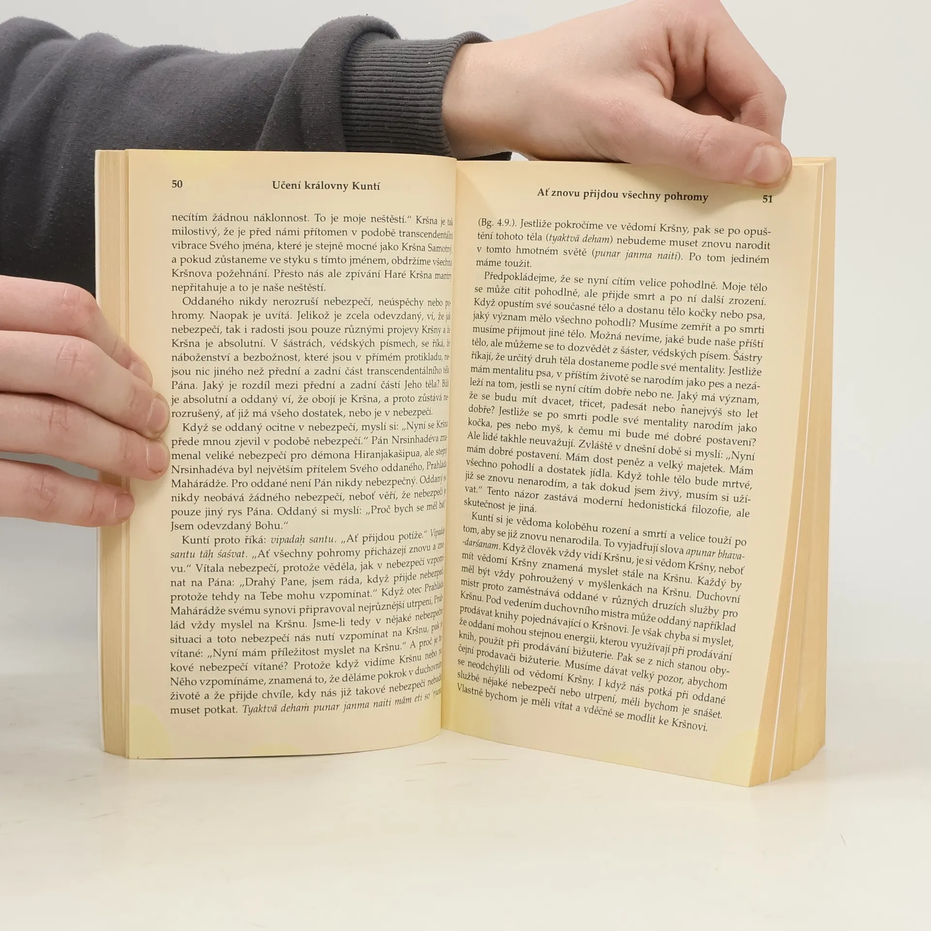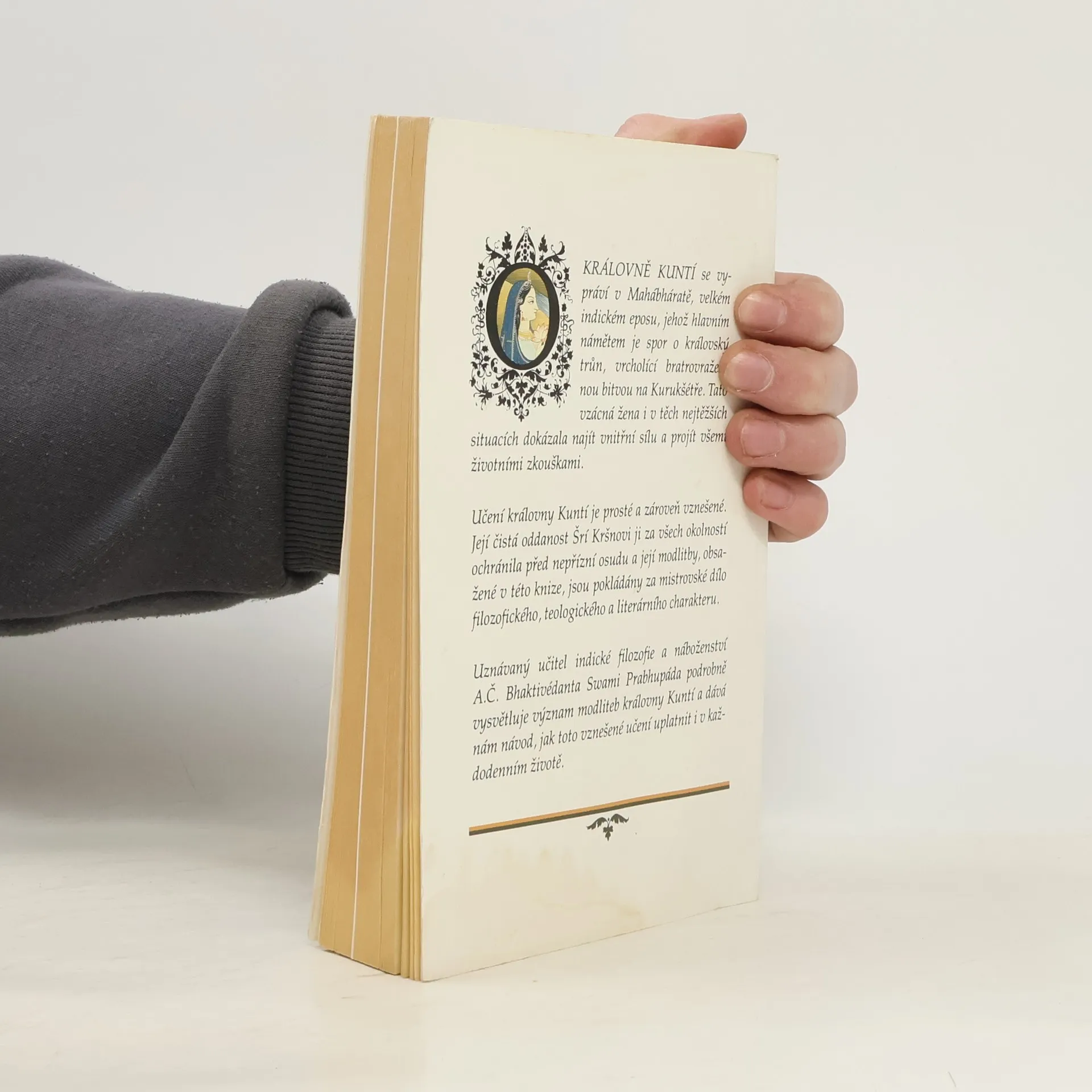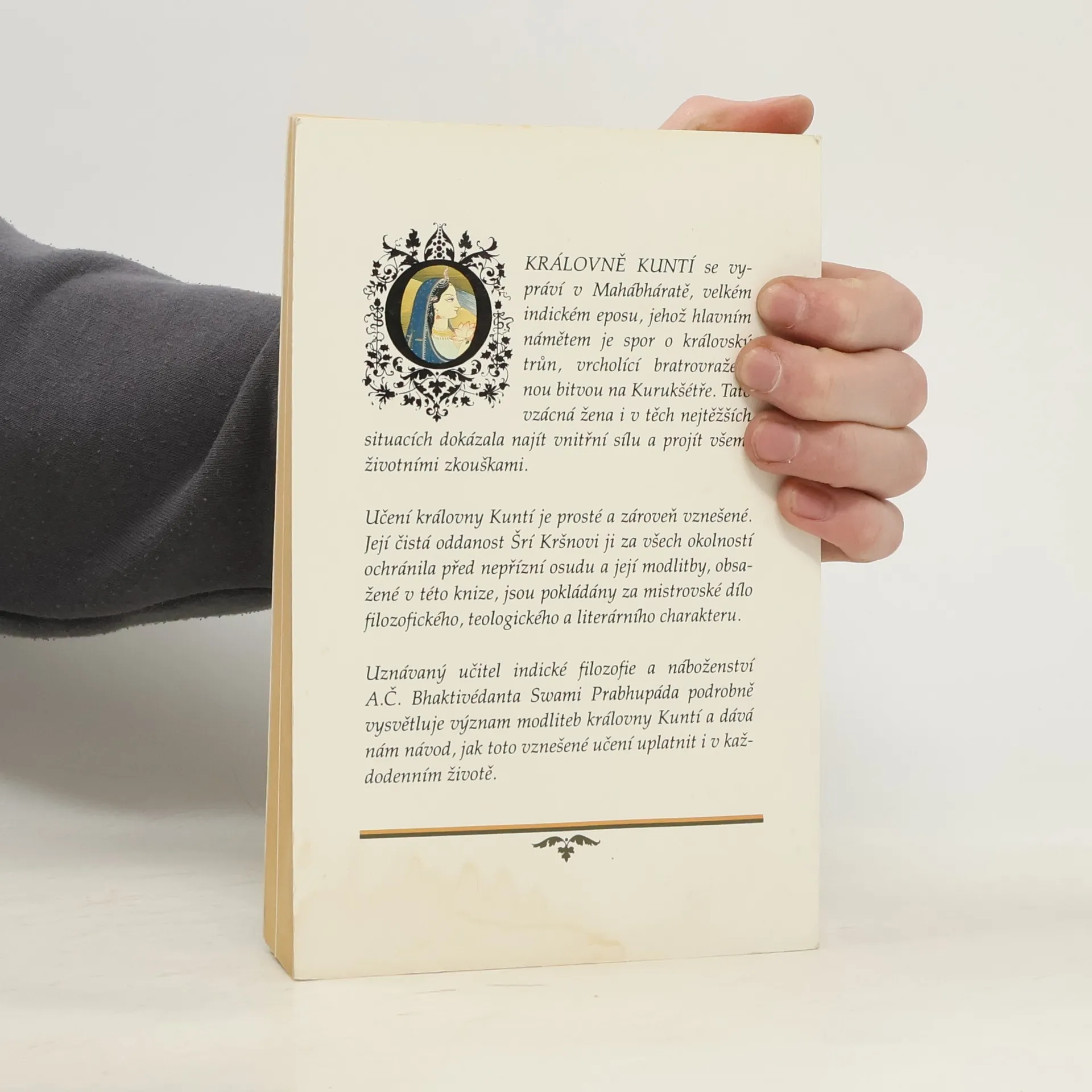 Na cestě ke Kršnovi. O KRÁLOVNĚ KUNTÍ se vypráví v Mahábháratě, velkém indickém eposu, jehož hlavním námětem je spor o královský trůn, vrcholící bratrovražednou bitvou na Kurukšétře. Tato vzácná žena i v těch nejtěžších situacích dokázala najít vnitřní sílu a projít všemi životními zkouškami. Učení královny Kuntí je prosté a zároveň vznešené. Její čistá oddanost Šrí Kršnovi ji za všech okolností ochránila před nepřízní osudu a její modlitby, obsažené v této knize, jsou pokládány za mistrovské dílo filozofického, teologického a literárního charakteru. Uznávaný učitel indické filozofie a náboženství A. Č. Bhaktivédanta Swami Prabhupáda podrobně vysvětluje význam modliteb královny Kuntí a dává nám návod, jak toto vznešené učení uplatnit i v každodenním životě.