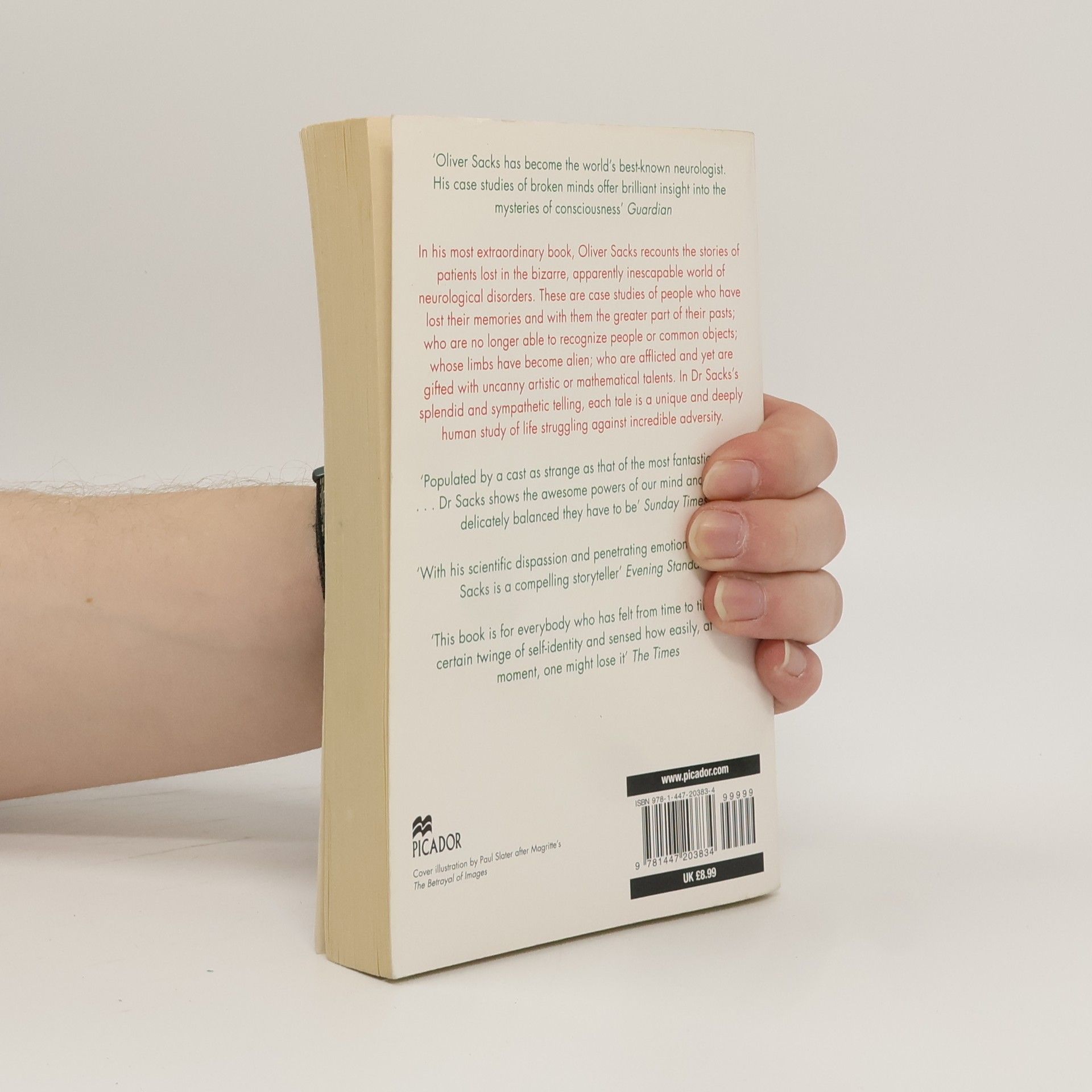 "Oliver Sacks has become the world's best-known neurologist. His case studies of broken minds offer brilliant insight into the mysteries of consciousness". ("Guardian"). In his most extraordinary book, Oliver Sacks recounts the stories of patients lost in the bizarre, apparently inescapable world of neurological disorders. These are case studies of people who have lost their memories and with them the greater part of their pasts; who are no longer able to recognize people or common objects; whose limbs have become alien; and, who are afflicted and yet are gifted with uncanny artistic or mathematical talents. In Dr Sacks' splendid and sympathetic telling, each tale is a unique and deeply human study of life struggling against incredible adversity. "Populated by a cast as strange as that of the most fantastic fiction ...Dr Sacks shows the awesome powers of our mind and just how delicately balanced they have to be". ("Sunday Times"). "With his scientific dispassion and penetrating emotional sympathy, Sacks is a compelling storyteller" Evening Standard. "This book is for everybody who has felt from time to time that certain twinge of self-identity and sensed how easily, at any moment, one might lose it" The Times