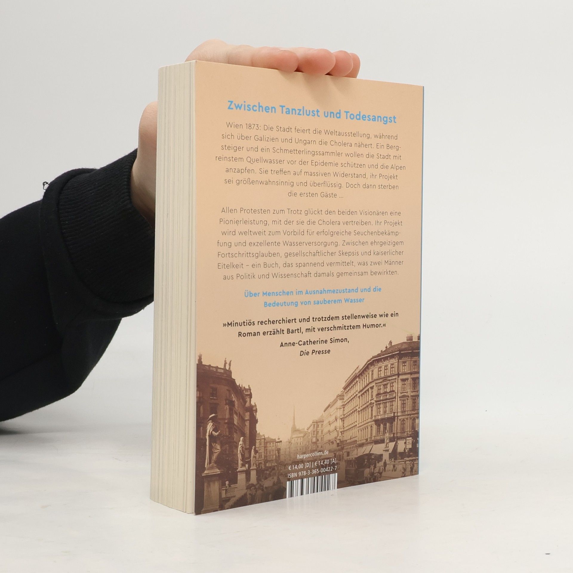 Zwischen Tanzlust und Todesangst – über Menschen im Ausnahmezustand und die Bedeutung von sauberem Wasser Wien 1873: Die Stadt feiert die Weltausstellung, während sich über Galizien und Ungarn die Cholera nähert. Ein Bergsteiger und ein Schmetterlingssammler wollen die Stadt mit reinstem Quellwasser vor der Epidemie schützen und die Alpen anzapfen. Sie treffen auf massiven Widerstand, ihr Projekt sei größenwahnsinnig und überflüssig. Doch dann sterben die ersten Gäste … Allen Protesten zum Trotz glückt den beiden Visionären eine Pionierleistung, mit der sie die Cholera vertreiben. Ihr Projekt wird weltweit zum Vorbild für erfolgreiche Seuchenbekämpfung und exzellente Wasserversorgung. Zwischen Tanzlust und Todesangst, ehrgeizigem Fortschrittsglauben, gesellschaftlicher Skepsis und kaiserlicher Eitelkeit – ein Buch, das spannend vermittelt, was zwei Männer aus Politik und Wissenschaft damals gemeinsam bewirkten. »Minutiös recherchiert und trotzdem stellenweise wie ein Roman erzählt Bartl, mit verschmitztem Humor.« Anne-Catherine Simon, Die Presse