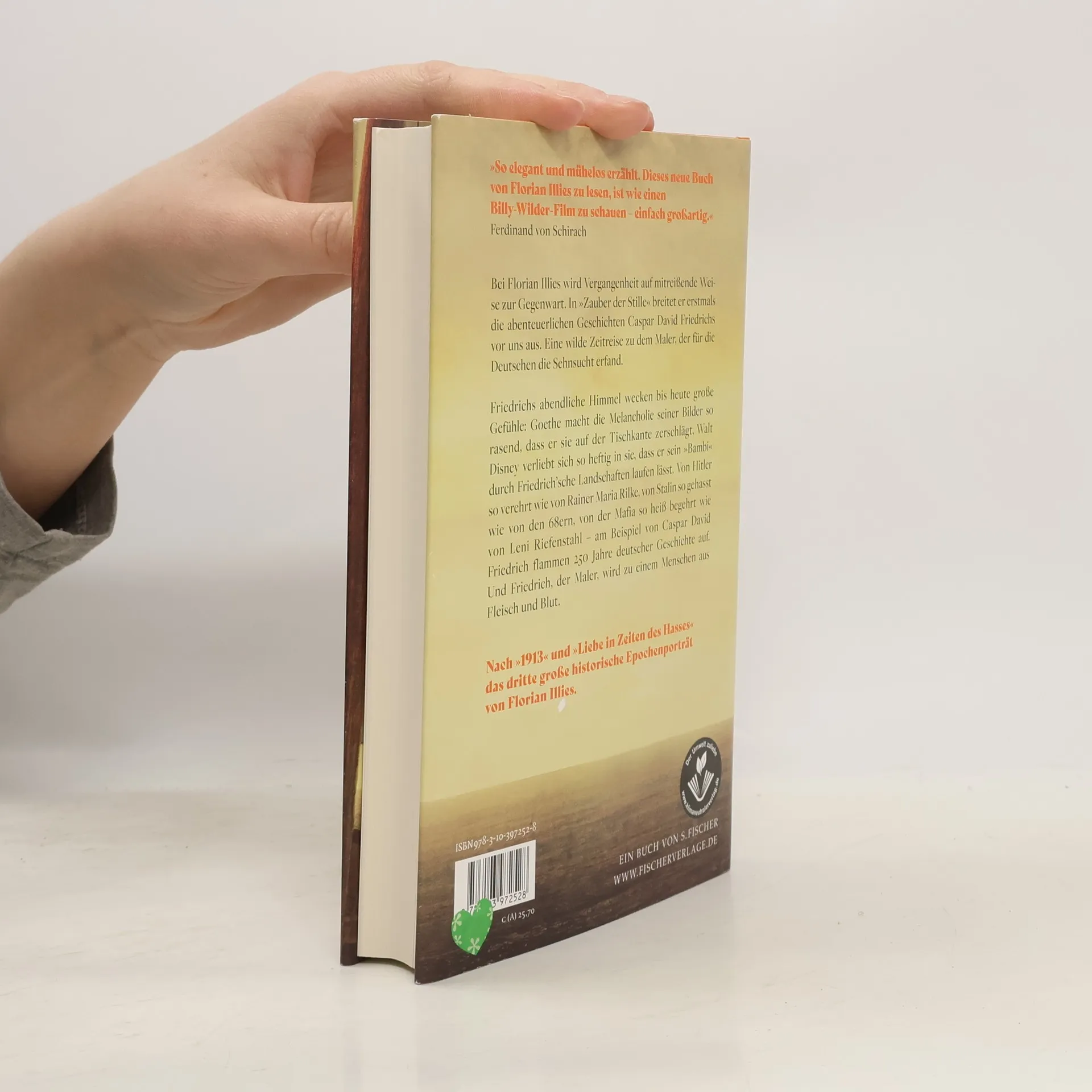 »So elegant und mühelos erzählt. Dieses neue Buch von Florian Illies zu lesen, ist wie einen Billy-Wilder-Film zu schauen – einfach großartig.« Ferdinand von Schirach Mit Florian Illies kann man Vergangenheit plötzlich als Gegenwart erleben. In »Zauber der Stille« breitet er erstmals die abenteuerlichen Geschichten Caspar David Friedrichs vor uns aus. Eine wilde Zeitreise zu dem Mann, der für die Deutschen die Sehnsucht erfand. Friedrichs abendliche Himmel wecken seit Jahrhunderten die leidenschaftlichsten Gefühle: Goethe macht ihre Melancholie so rasend, dass er sie auf der Tischkante zerschlagen will, Walt Disney hingegen verliebt sich so heftig in sie, dass er sein »Bambi« nur durch Friedrich'sche Landschaften laufen lässt. Von Hitler so verehrt wie von Rainer Maria Rilke, von Stalin so gehasst wie von den 68ern, von der Mafia so heiß begehrt wie von Leni Riefenstahl – am Beispiel von Caspar David Friedrich werden in diesem mitreißend erzählten Buch 250 Jahre deutscher Geschichte sichtbar. Und Friedrich, der Maler, wird zu einem Menschen aus Fleisch und Blut. Nach »1913« und »Liebe in Zeiten des Hasses« das dritte große historische Epochenportrait von Florian Illies.