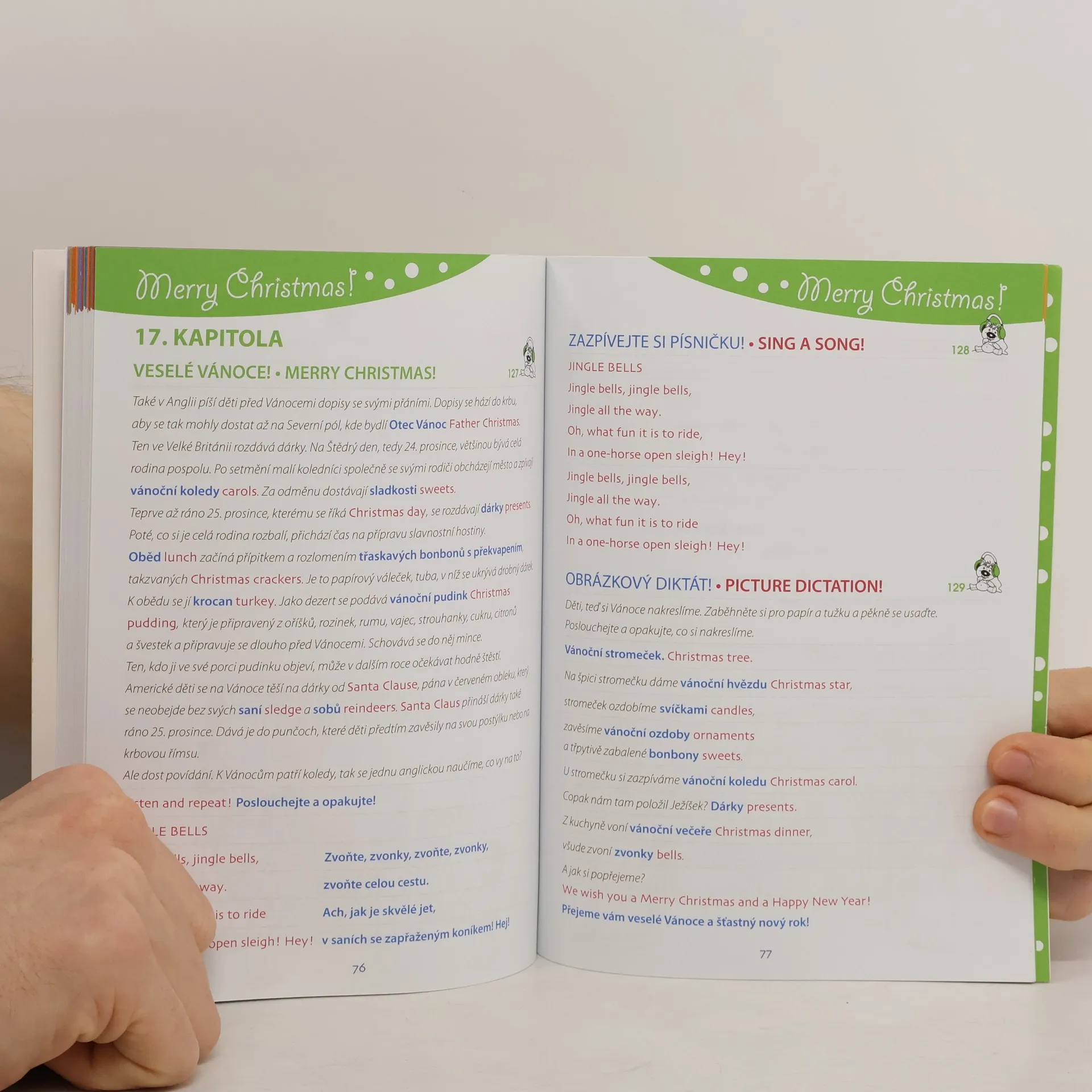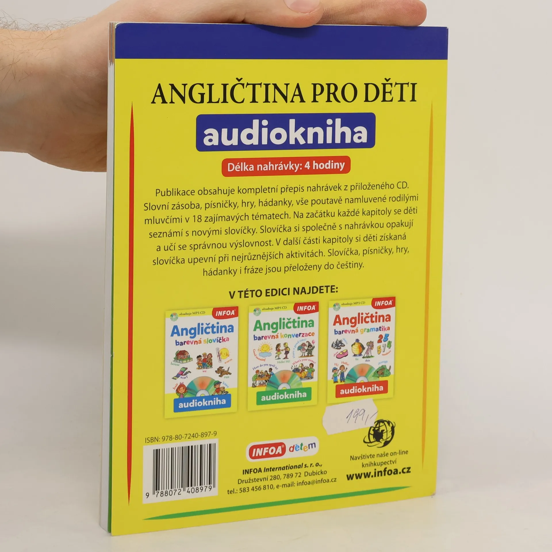 Publikace obsahuje kompletní přepis nahrávek z přiloženého CD. Slovní zásoba, písničky, hry, hádanky, vše poutavě namluvené rodilými mluvčími v 18 zajímavých tématech. Na začátku každé kapitoly se děti seznámí s novými slovíčky. Slovíčka si společně s nahrávkou opakují a učí se správnou výslovnost. V další části kapitoly se děti získaná slovíčka upevní v nejrůznějších aktivitách. Slovíčka, písničky, hry, hádanky i fráze jsou přeloženy do češtiny.