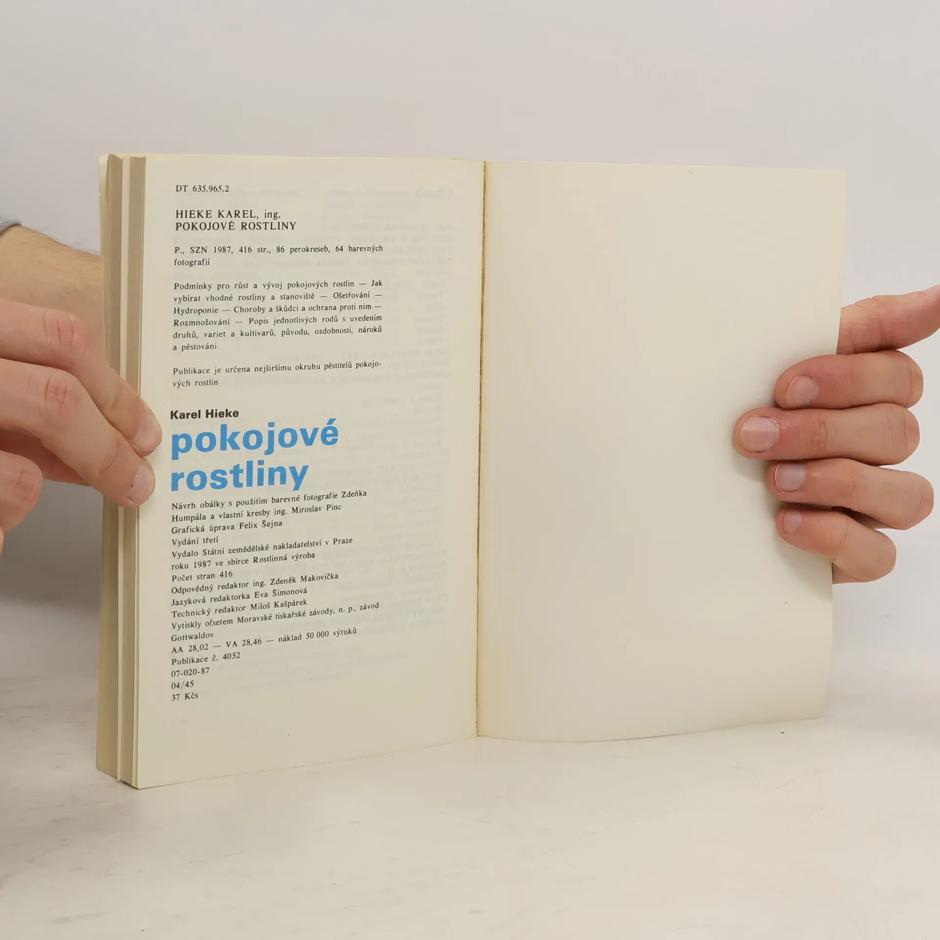 Vše o pokojových rostlinách, jak je přesazovat, pěstovat, jaké jsou variety jednotlivých květin. Možnost pěstování, výběr podmínek a pod. Rostliny jsou řazeny abecedně, takže každý rychle najde tu svou, pokud nevíte jak se ta Vaše kytka jmenuje stačí trochu zdlouhavé listování a podleperokreseb lze rostlinu najít. Ilustrace a obálku navrhl Miroslav Pinc; fotografie Zdeněk Humpál, Michal Vokřál; grafická úprava Felix Šejna. 3. doplněné vydání.