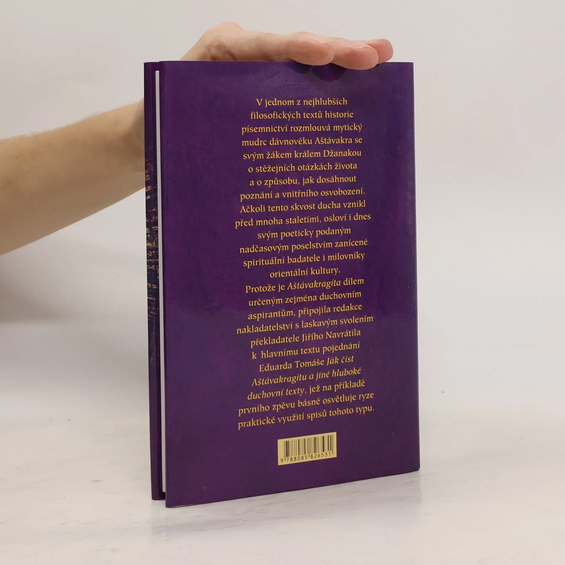V jednom z nejhlubších filosofických textů historie rozmlouvá mytický mudrc dávnověku Aštávakra se svým žákem králem Džanakou o nejzazších otázkách života a o způsobu, jak dosáhnout poznání a vnitřního osvobození. Ačkoli tento skvost ducha vznikl před mnoha staletími, osloví i dnes svým poeticky podaným nadčasovým poselstvím zanícené spirituální badatele i milovníky orientální kultury. Z německých překladů přeložil a předmluvu napsal Jiří Navrátil. Podle sanskrtského originálu zrevidoval Dr. Boris Merhaut.