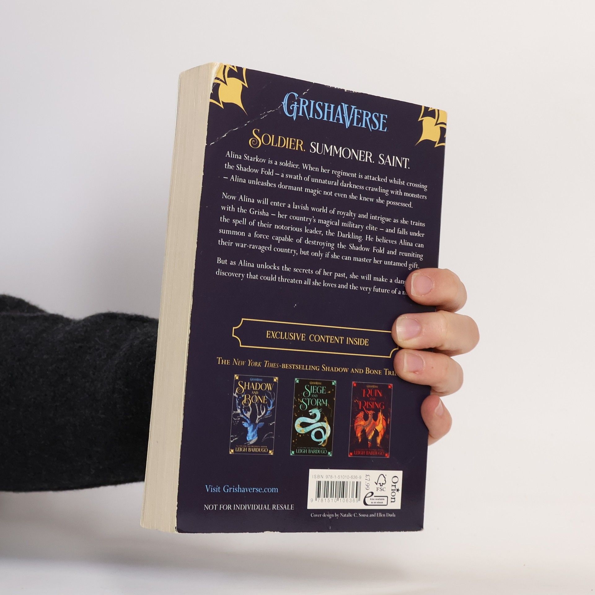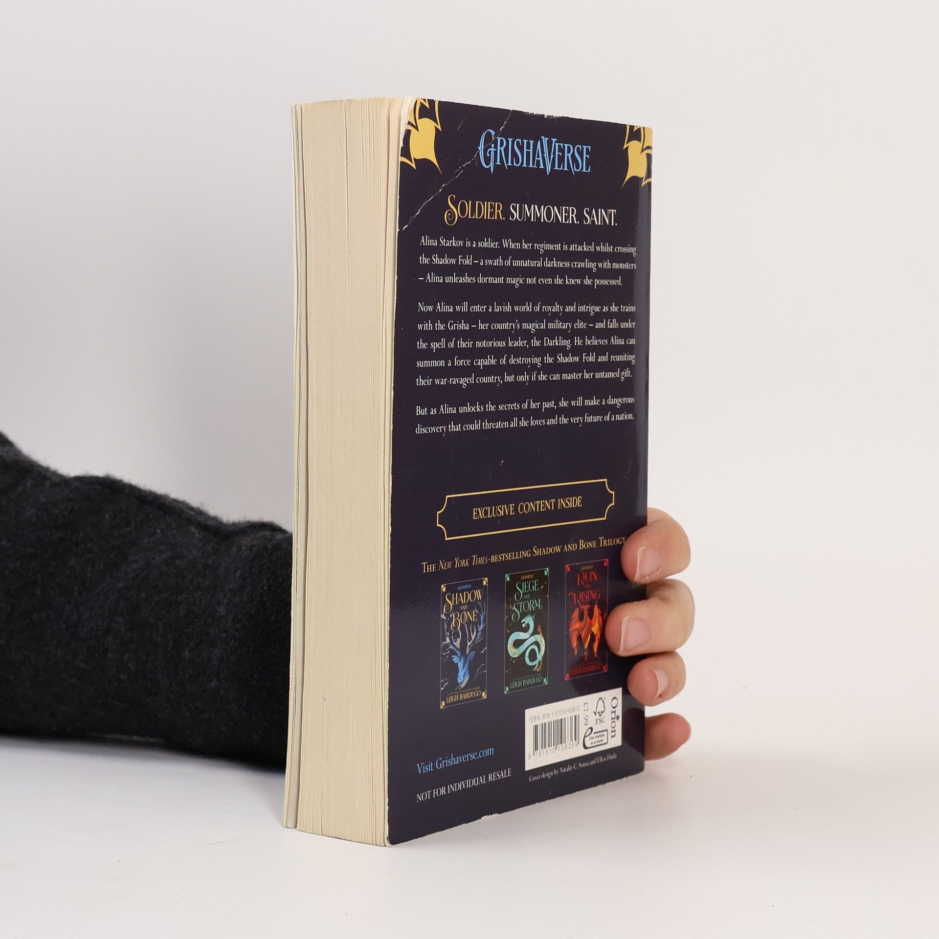 Surrounded by enemies, the once-great nation of Ravka has been torn in two by the Shadow Fold, a swath of near impenetrable darkness crawling with monsters who feast on human flesh. Now its fate may rest on the shoulders of one lonely refugee. Alina Starkov has never been good at anything. But when her regiment is attacked on the Fold and her best friend is brutally injured, Alina reveals a dormant power that saves his life—a power that could be the key to setting her war-ravaged country free. Wrenched from everything she knows, Alina is whisked away to the royal court to be trained as a member of the Grisha, the magical elite led by the mysterious Darkling. Yet nothing in this lavish world is what it seems. With darkness looming and an entire kingdom depending on her untamed power, Alina will have to confront the secrets of the Grisha . . . and the secrets of her heart. Shadow and Bone is the first installment in Leigh Bardugo's Grisha Trilogy.