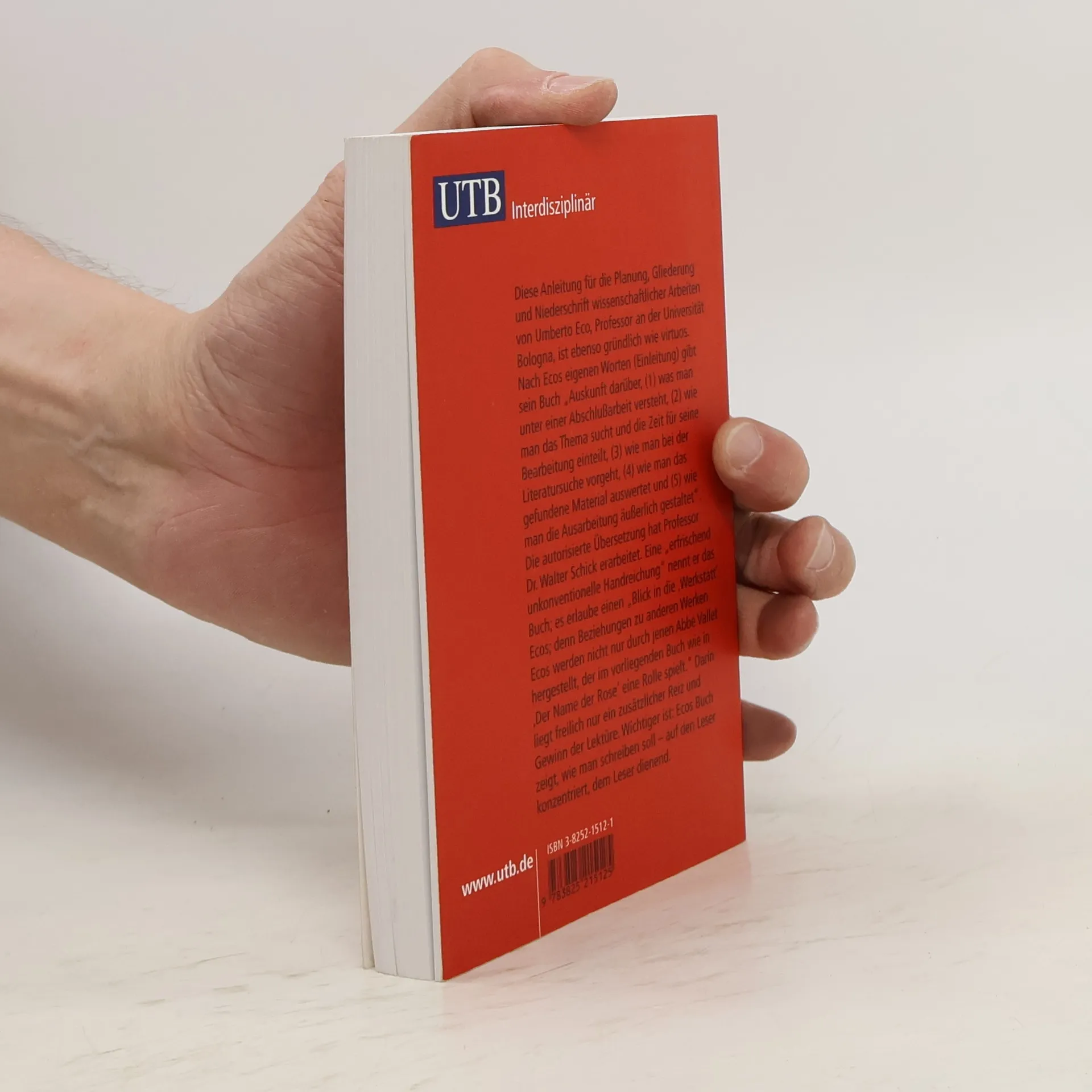 Diese Anleitung für die Planung, Gliederung und Niederschrift wissenschaftlicher Arbeiten von Umberto Eco, Professor an der Universität Bologna, ist ebenso gründlich wie virtuos. Nach Ecos eigenen Worten (Einleitung) gibt sein Buch „Auskunft darüber, (1) was man unter einer Abschlussarbeit versteht, (2) wie man das Thema sucht und die Zeit für seine Bearbeitung einteilt, (3) wie man bei der Literatursuche vorgeht, (4) wie man das gefundene Material auswertet und (5) wie man die Ausarbeitung äußerlich gestaltet“. Die autorisierte Übersetzung hat Professor Dr. Walter Schick erarbeitet. Eine „erfrischend unkonventionelle Handreichung“ nennt er das Buch; es erlaube einen "Blick in die 'Werkstatt' Ecos; denn Beziehungen zu anderen Werken Ecos werden nicht nur durch jenen Abbé Vallet hergestellt, der im vorliegenden Buch wie in 'Der Name der Rose' eine Rolle spielt." Darin liegt freilich nur ein zusätzlicher Reiz und Gewinn der Lektüre. Wichtiger ist: Ecos Buch zeigt, wie man schreiben soll - auf den Leser konzentriert, dem Leser dienend.
