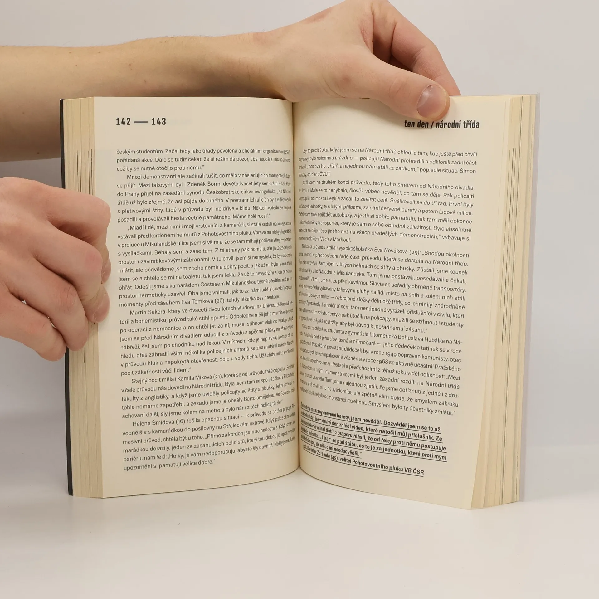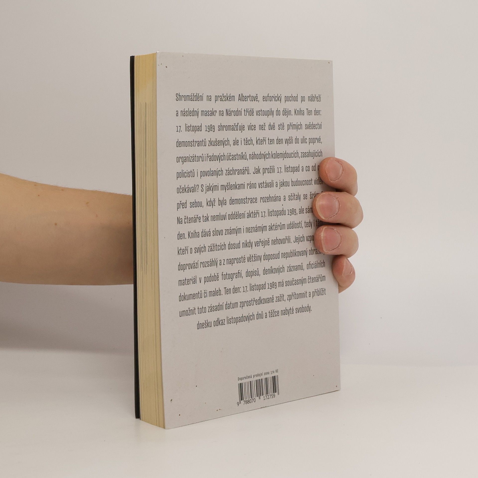Shromáždění na pražském Albertově, euforický pochod po nábřeží a následný masakr na Národní třídě vstoupily do dějin. Kniha Ten den: 17. listopad 1989 shromažďuje více než dvě stě přímých svědectví demonstrantů zkušených, ale i těch, kteří ten den vyšli do ulic poprvé, organizátorů i řadových účastníků, náhodných kolemjdoucích, zasahujících policistů i povolaných záchranářů. Jak prožili 17. listopad a co od něj očekávali? S jakými myšlenkami ráno vstávali a jakou budoucnost viděli před sebou, když byla demonstrace rozehnána a sčítaly se šrámy? Na čtenáře tak nemluví oddělení aktéři 17. listopadu 1989, ale sám tento den. Dává slovo známým i neznámým aktérům událostí, tedy i těm, kteří o svých zážitcích dosud nikdy veřejně nehovořili. Jejich vzpomínky doprovází rozsáhlý a z naprosté většiny doposud nepublikovaný obrazový materiál v podobě fotografií, dopisů, deníkových záznamů, oficiálních dokumentů či maleb. Ten den: 17. listopad 1989 má současným čtenářům umožnit toto zásadní datum zprostředkovaně zažít, zpřítomnit a přiblížit dnešku odkaz revolučních dnů a těžce nabyté svobody.