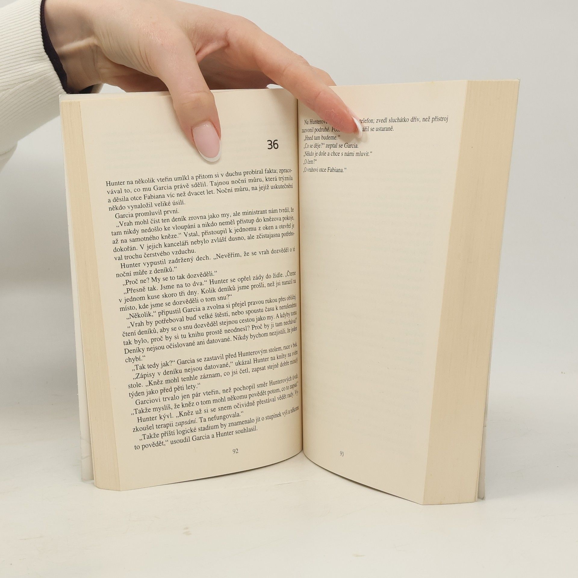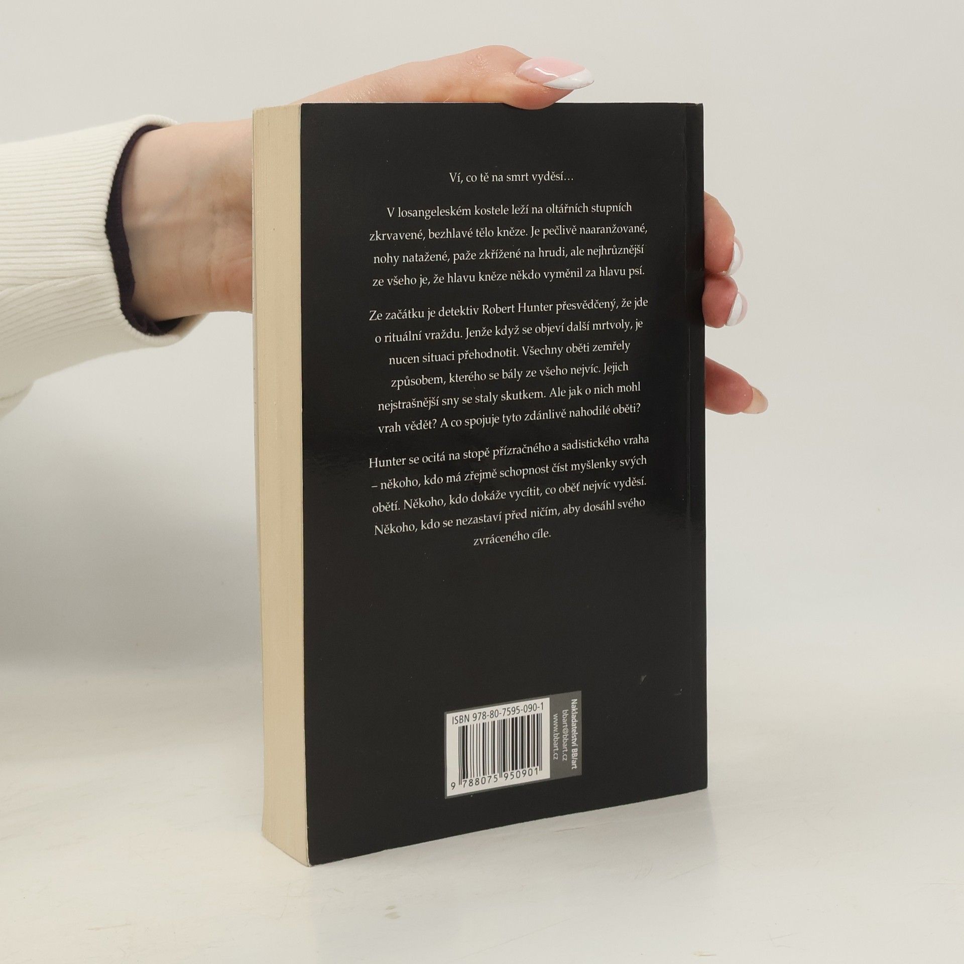 Ví, co tě na smrt vyděsí… V losangeleském kostele leží na oltářních stupních zkrvavené, bezhlavé tělo kněze. Je pečlivě naaranžované, nohy natažené, paže křížené na hrudi, ale nejhrůznější ze všeho je, že hlavu kněze někdo vyměnil za hlavu psí. Ze začátku je detektiv Robert Hunter přesvědčený, že jde o rituální vraždu. Jenže když se objeví další mrtvoly, je nucen situaci přehodnotit. Všechny oběti zemřely způsobem, kterého se bály ze všeho nejvíc. Jejich nejstrašnější sny se staly skutkem. Ale jak o nich mohl vrah vědět? A co spojuje tyto zdánlivě nahodilé oběti? Hunter se ocitá na stopě přízračného a sadistického vraha – někoho, kdo má zřejmě schopnost číst myšlenky svých obětí. Někoho, kdo dokáže vycítit, co oběť nejvíc vyděsí. Někoho, kdo se nezastaví před ničím, aby dosáhl svého zvráceného cíle.