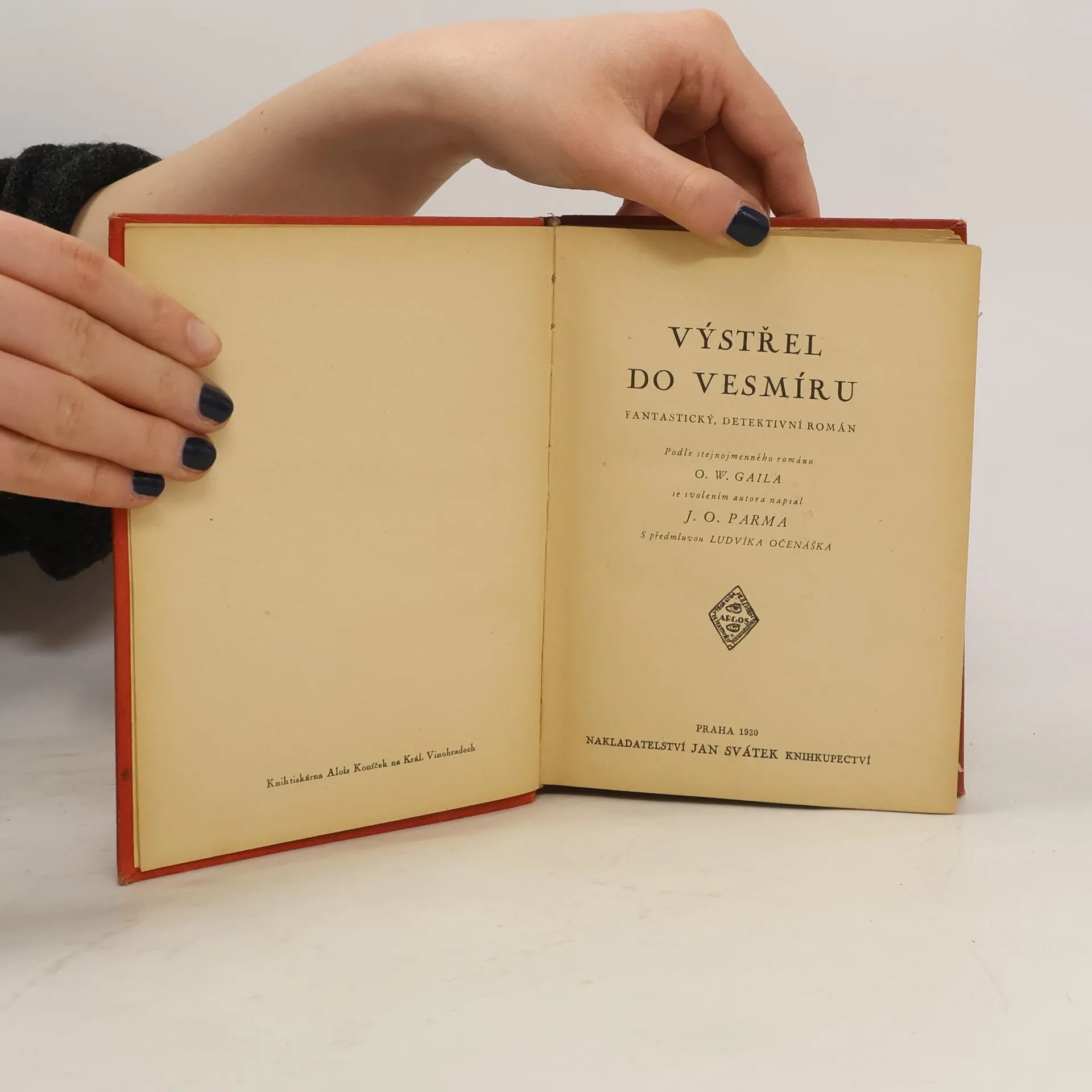 Fantastický, detektivní román Podle stejnojmenného románu O.W. Gaila se svolením autora napsal J.O. Parma Ve skutečnosti jde o přepis románu německého spisovatele O. W. Gaila Výstřel do vesmíru, pouze jména a některé reálie byly změněny na české. Autor se k tomu na titulní straně přiznává, takže spíše než o plagiát jde o upravený překlad. Dva konstruktéři, Rus Suchinov a Čech Horáček, nezávisle na sobě pracují na konstrukci kosmické lodi. Suchinov ji s finanční pomocí rumunského boháče dokončí dříve a vyšle ji do vesmíru, kde ale raketa uvízne v gravitaci Měsíce. Horáček dokončí svou vlastní raketu Slavia a s posádkou deseti lidí (plus černým pasažérem Suchinovem) úspěšně ruskou raketu i její pilotku Natašu zachrání.