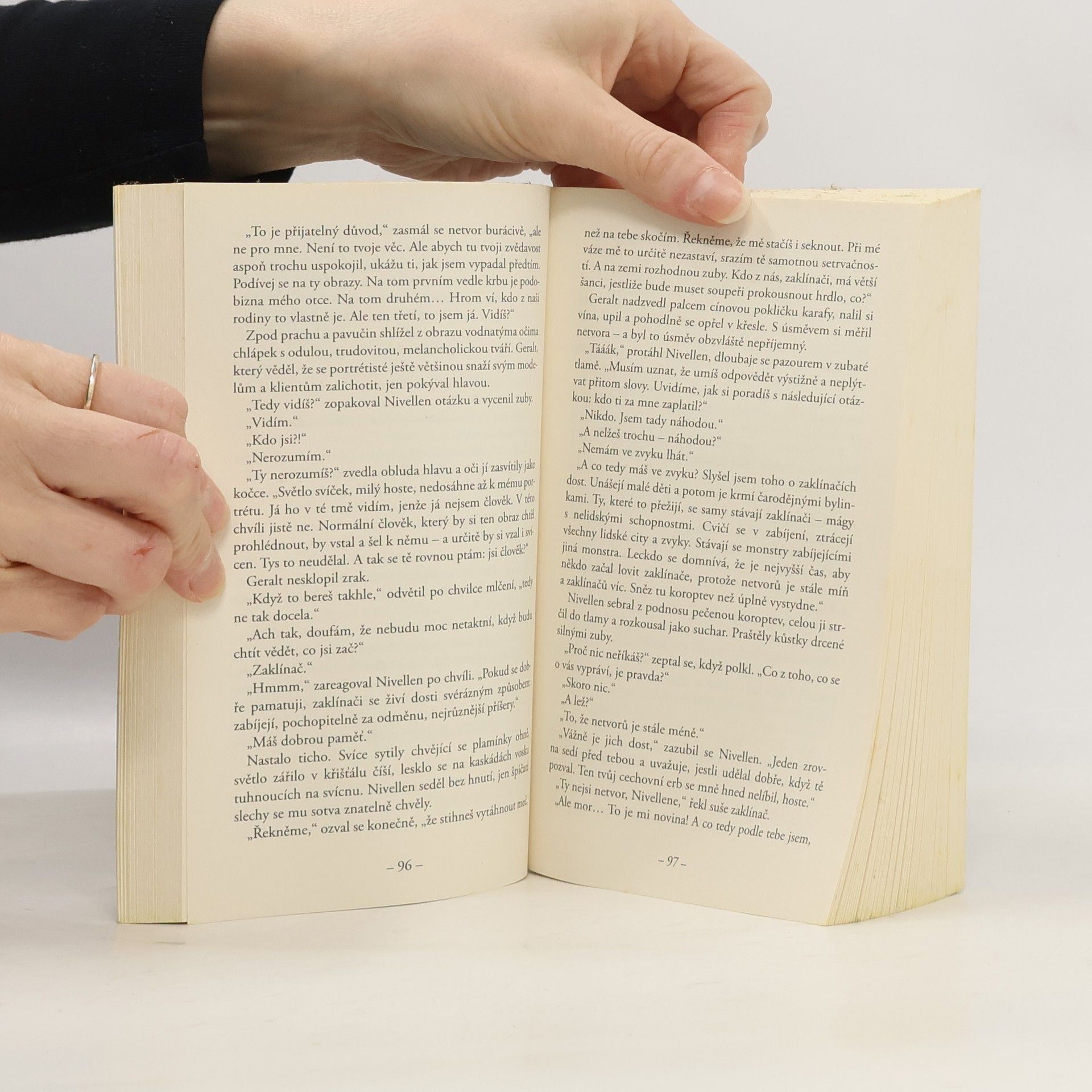 Zaklínač... Ošlehaný muž bez věku, jehož bílé vlasy nejsou znakem stáří, ale mutace, kterou musel podstoupit. Placený i dobrovolný likvidátor prapodivných tvorů – mantichor, trollů, vidlohonů, strig, amfisbain – pokud ovšem ohrožují lidský rod; v takovém případě zabíjí i bytost zvanou člověk. Prvotřídní, skvělý bojovník, který není neporazitelný ani nezranitelný – naopak, téměř z každého dobrodružství si odnáší další šrámy na těle i na duši. Nově přeložené geraltovské povídky ze Stříbrného meče, něco z Věčného ohně a Meče osudu, doplněné povídkou Hlas rozumu, kde Geralt vysvětluje, jak to všechno začalo. Povídky: - Cesta, z níž není návratu (Droga, z której się nie wraca) - Hlas rozumu (Głos rozsądku) - Zaklínač (Wiedźmin) - Zrnko pravdy (Ziarno prawdy) - Menší zlo (Mniejsze zło) - Otázka ceny (Kwestia ceny) - Konec světa (Kraniec świata) - Poslední přání (Ostatnie życzenie)