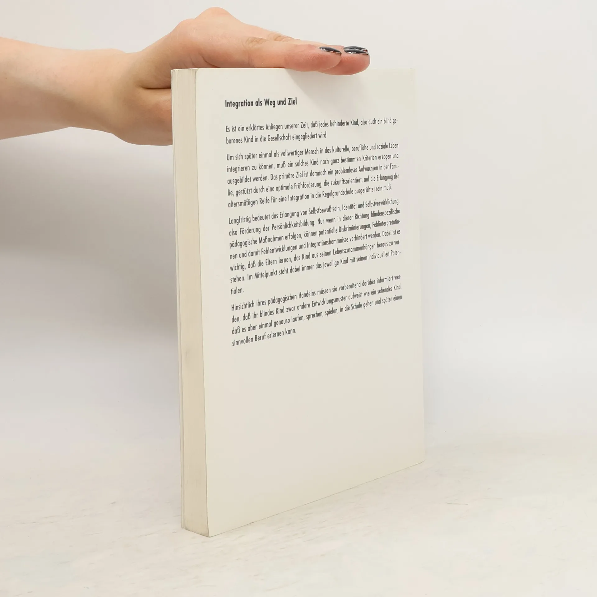 Es ist ein erklärtes Anliegen unserer Zeit, das jedes behinderte Kind, also auch ein blind geborenes Kind in die Gesellschaft eingegliedert wird. Um sich später einmal als vollwertiger Mensch in das kulturelle, berufliche und soziale Leben integrieren zu können, muß ein solches Kind nach ganz bestimmten Kriterien erzogen und ausgebildet werden. Das primäre Ziel ist demnach ausgerichtet auf die Erlangung der altersmäßigen Reife für eine Integration in die Regelgrundschule.