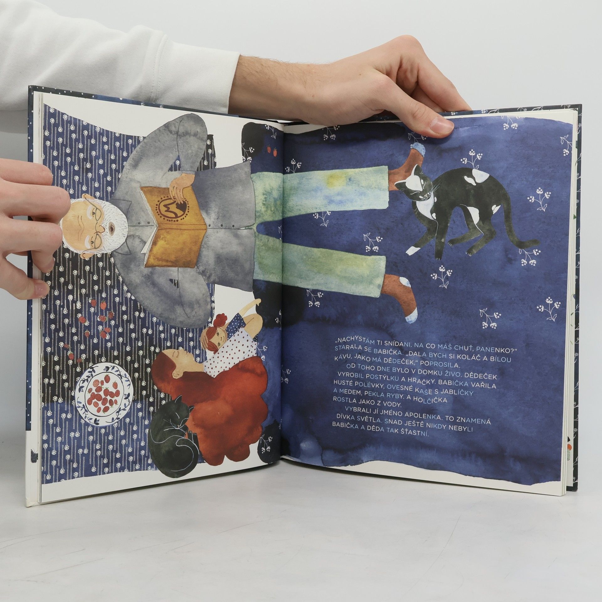 Žili byli dědeček s babičkou, dobře si žili, rádi se měli, jen děti jim chyběly. Až jednou našli opuštěnou panenku s rezavými vlásky, která se do rána proměnila v holčičku Apolenku. Na pohádkovém půdorysu vyrostl jednoduchý příběh oslavující krásu pozapomenuté techniky modrotisku a rozmanitost lidových vzorů.