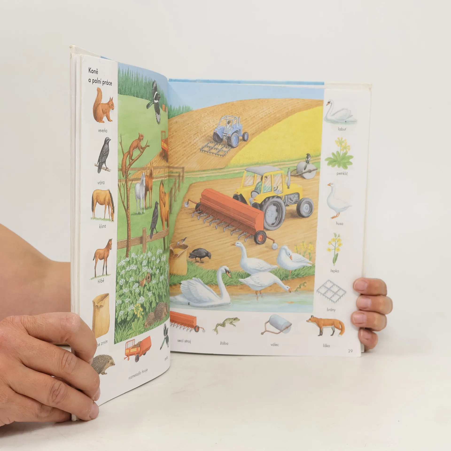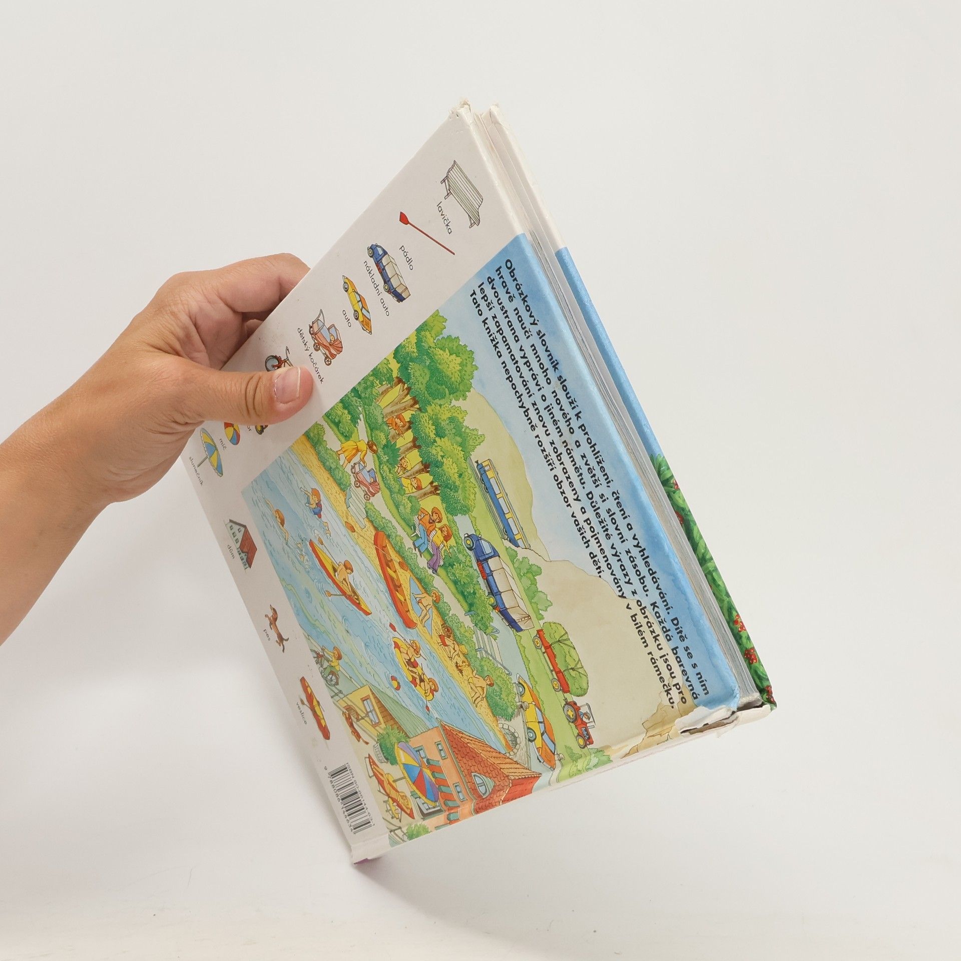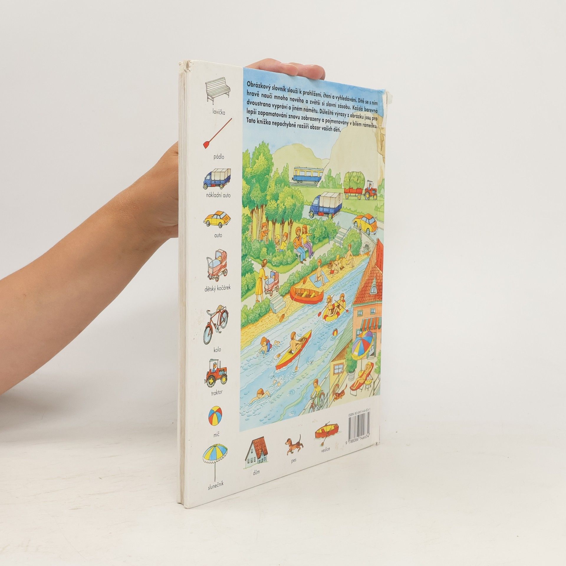 Zvídavým i zvědavým dětem nabízíme 44 dvoustran s nejrůznějšími výjevy z daného prostředí (pole, dvůr, dům, byt, obchod, cesta, letiště...), na okraji doplněné malými obrázky s názvy předmětů patřících do tohoto prostředí. Přednosti této názorné pomůcky k rozvíjení poznatků a rozumových schopností dětí předškolního i mladšího školního věku.