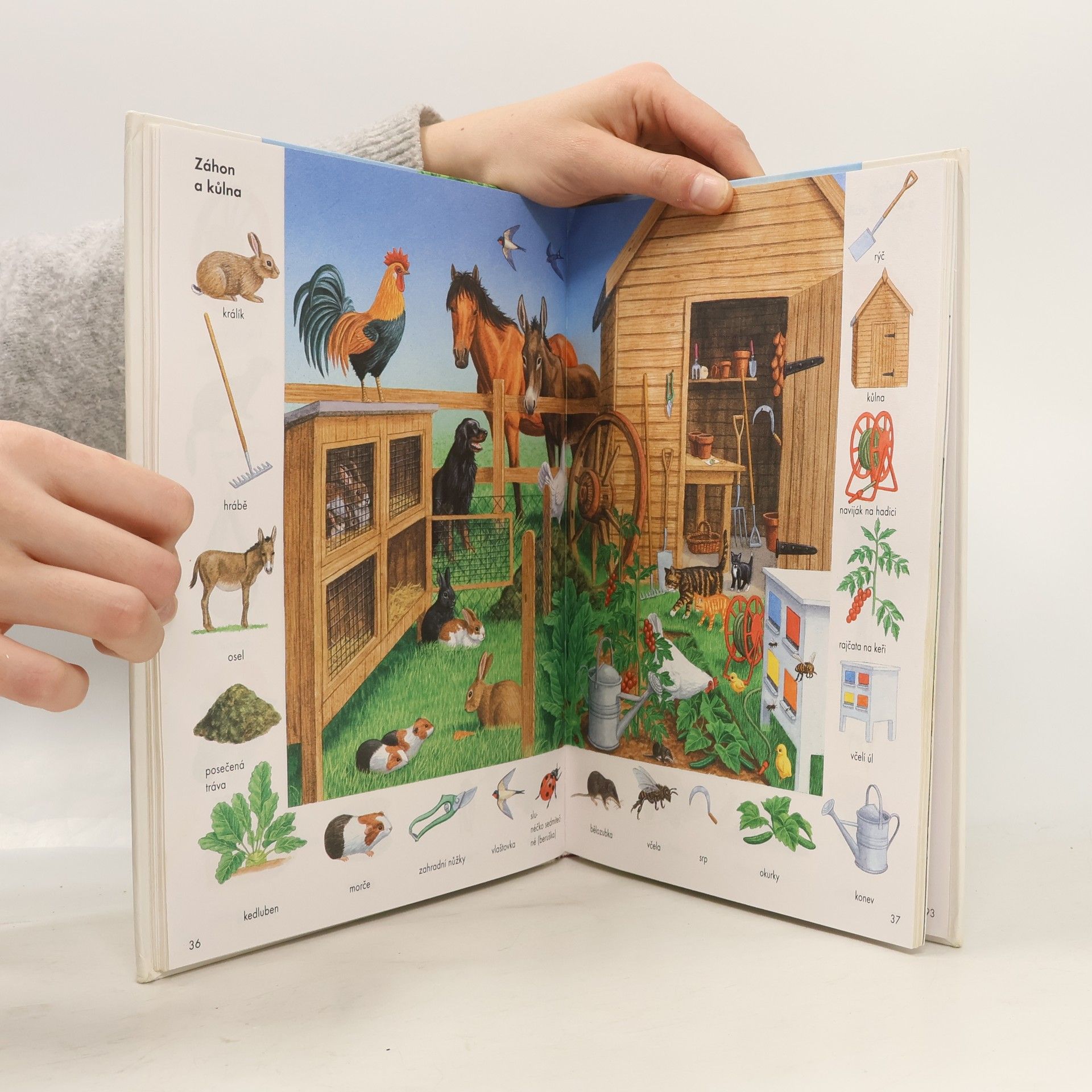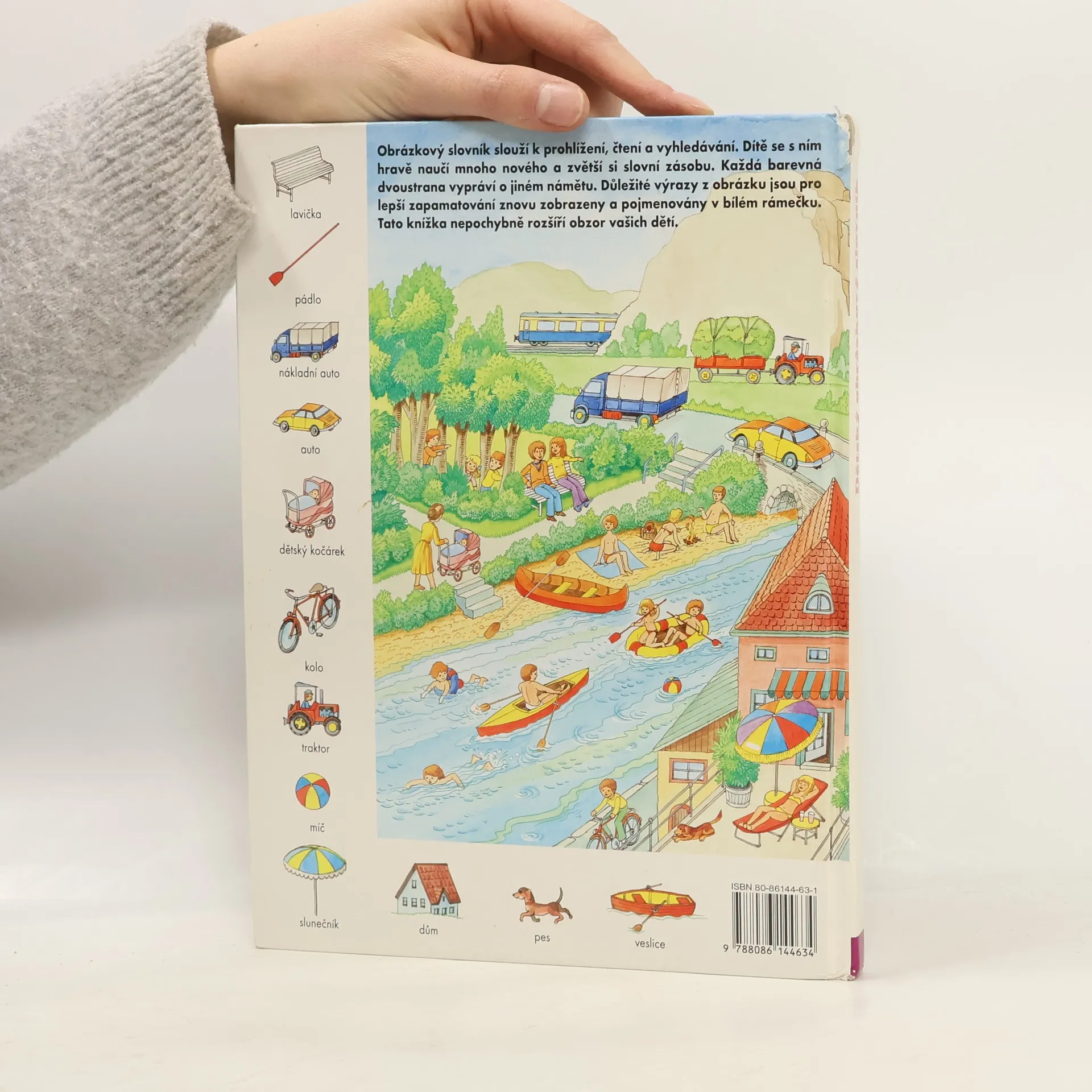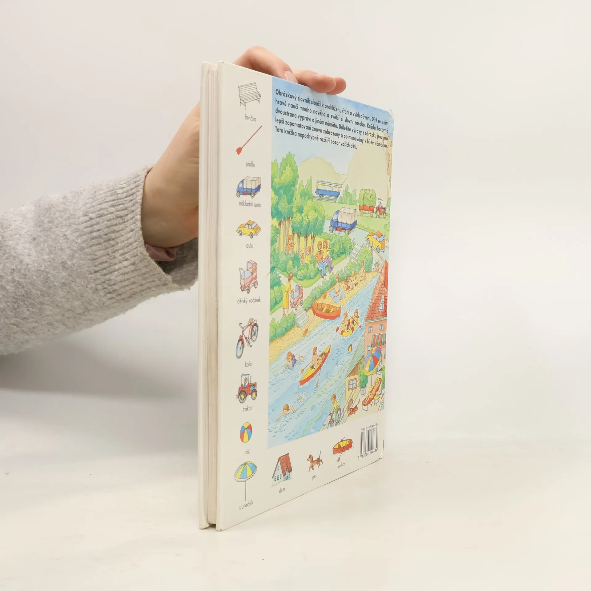 Zvídavým i zvědavým dětem nabízíme 44 dvoustran s nejrůznějšími výjevy z daného prostředí (pole, dvůr, dům, byt, obchod, cesta, letiště...), na okraji doplněné malými obrázky s názvy předmětů patřících do tohoto prostředí. Přednosti této názorné pomůcky k rozvíjení poznatků a rozumových schopností dětí předškolního i mladšího školního věku.
