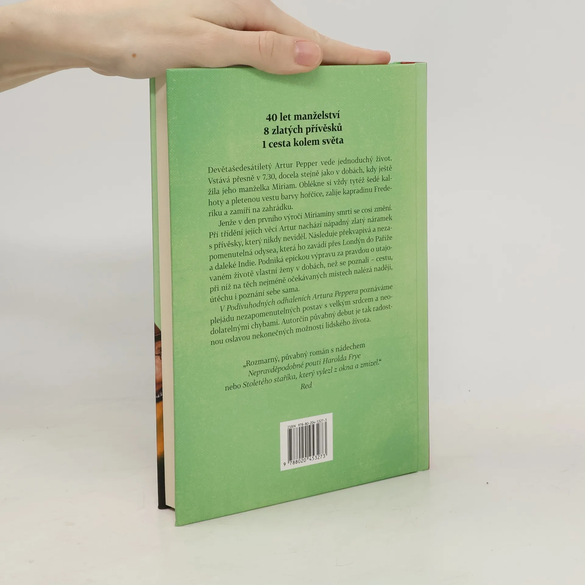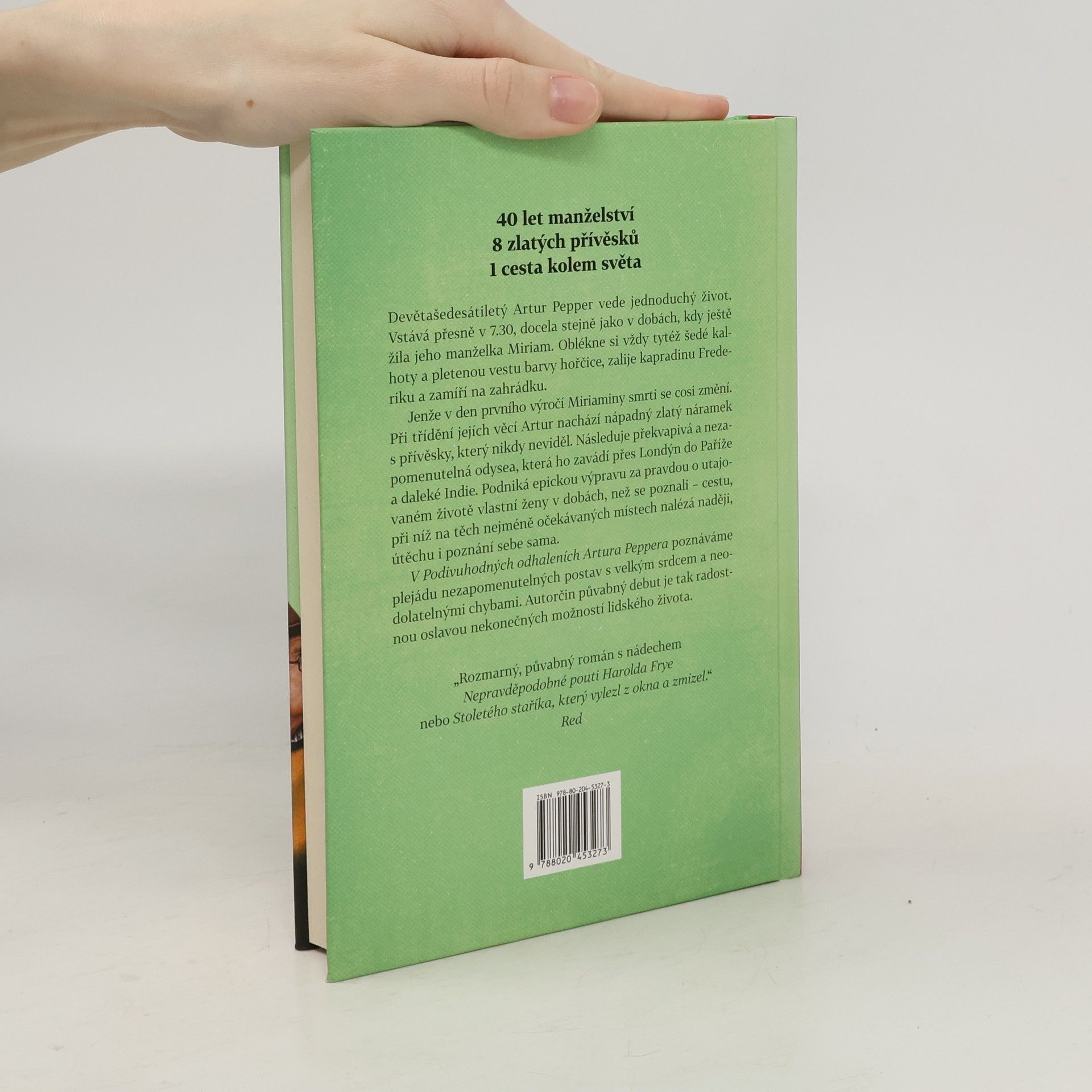Devětašedesátiletý Artur Pepper vede jednotvárný život. Vstává přesně v 7.30, docela stejně jako v dobách, kdy ještě žila jeho manželka Miriam. Oblékne si vždy tytéž šedé kalhoty a pletenou vestu barvy hořčice, zalije kapradinu Frederiku a zamíří na zahrádku. Jenže v den prvního výročí Miriaminy smrti se cosi změní. Při třídění jejích věcí Artur nachází nápadný zlatý náramek s přívěsky, který nikdy neviděl. Následuje překvapivá a nezapomenutelná odysea, která ho zavádí přes Londýn do Paříže a daleké Indie. Podniká epickou výpravu za pravdou o utajovaném životě vlastní ženy v dobách, než se poznali - cestu, při níž na těch nejméně očekávaných místech nalézá naději, útěchu i poznání sebe sama. V Podivuhodných odhaleních Artura Peppera poznáváme plejádu nezapomenutelných postav s velkým srdcem a neodolatelnými chybami. Autorčin půvabný debut je tak radostnou oslavou nekonečných možností lidského života.