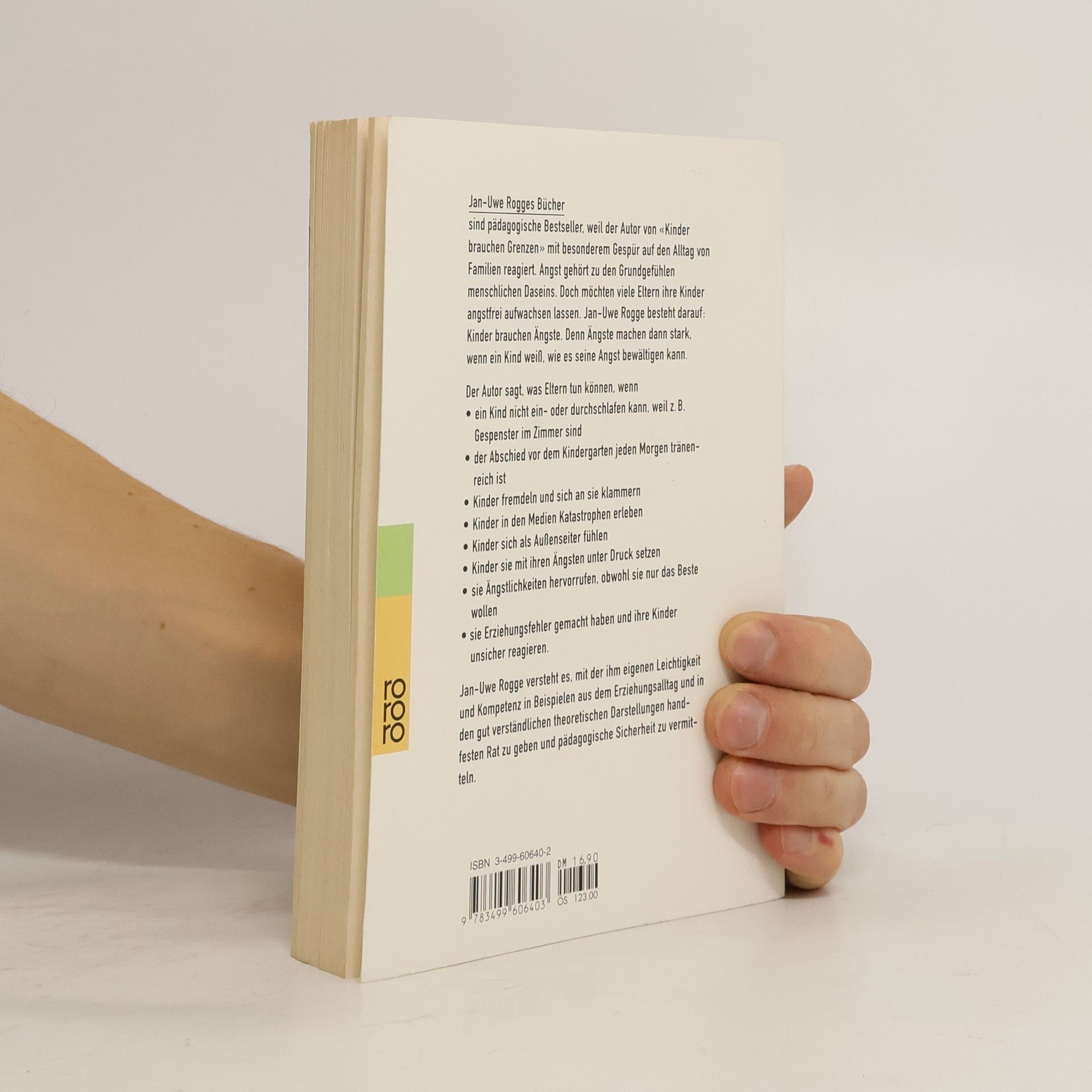 Jan-Uwe Rogges Bücher sind pädagogische Bestseller, weil der Autor von „Kinder brauchen Grenzen“ mit besonderem Gespür auf den Alltag von Familien reagiert. Angst gehört zu den Grundgefühlen menschlichen Daseins. Doch möchten viele Eltern ihre Kinder angstfrei aufwachsen lassen. Jan-Uwe Rogge besteht darauf: Kinder brauchen Ängste. Denn Ängste machen dann stark, wenn ein Kind weiß, wie es seine Angst bewältigen kann. Der Autor sagt, was Eltern tun können, wenn- ein Kind nicht ein- oder durchschlafen kann, weil z. B. Gespenster im Zimmer sind- der Abschied vor dem Kindergarten immer tränenreich ist- Kinder fremdeln und sich an sie klammern- Kinder in den Medien Katastrophen erleben- Kinder sich als Außenseiter fühlen- Kinder sie mit ihren Ängsten unter Druck setzen- sie Ängste hervorrufen, obwohl sie nur das Beste wollen- sie Fehler gemacht haben und ihre Kinder unsicher reagieren.Dr. Jan-Uwe Rogge versteht es, mit der ihm eigenen Leichtigkeit und Kompetenz in Beispielen aus dem Erziehungsalltag und in den gut verständlichen theoretischen Darstellungen handfesten Rat zu geben und pädagogische Sicherheit zu vermitteln.