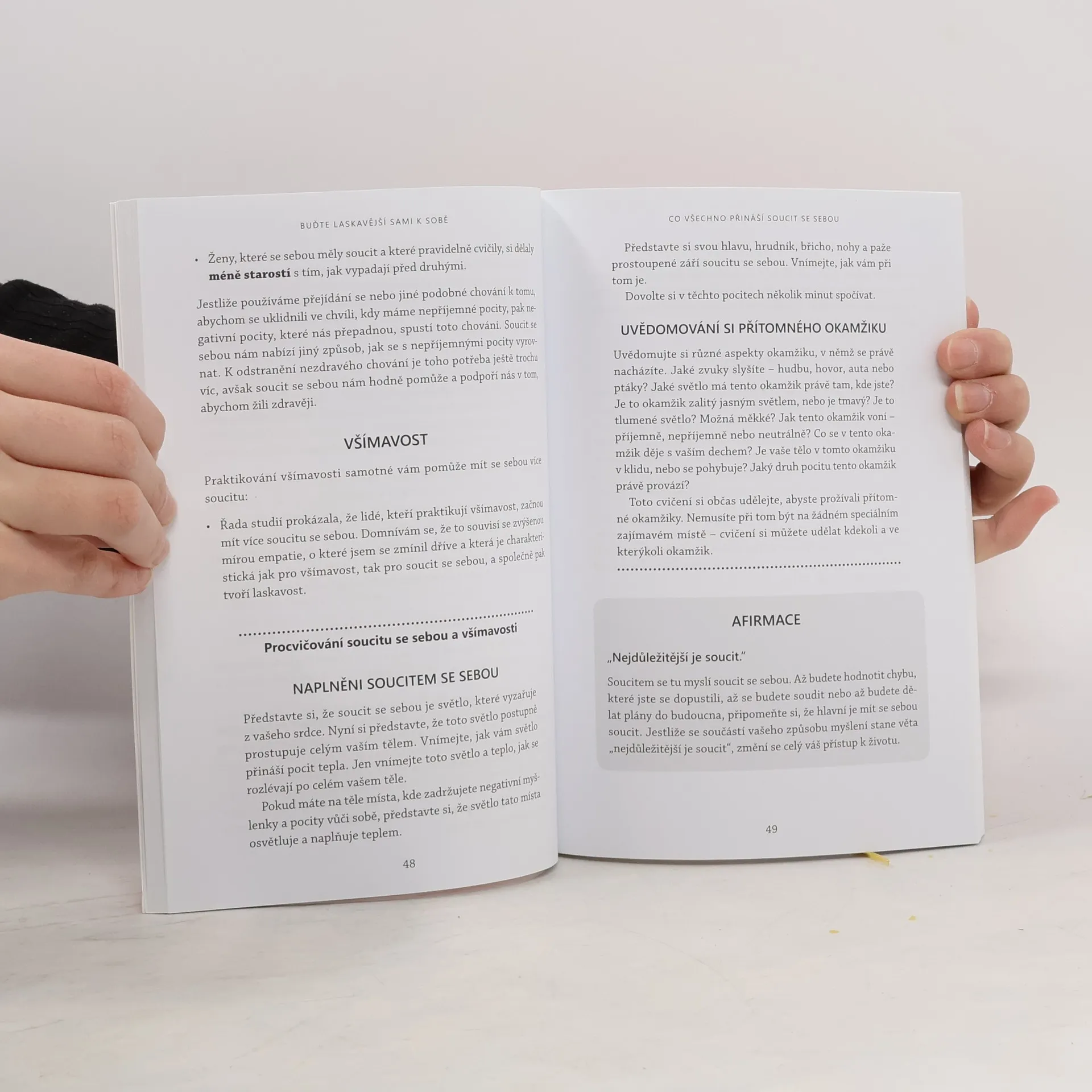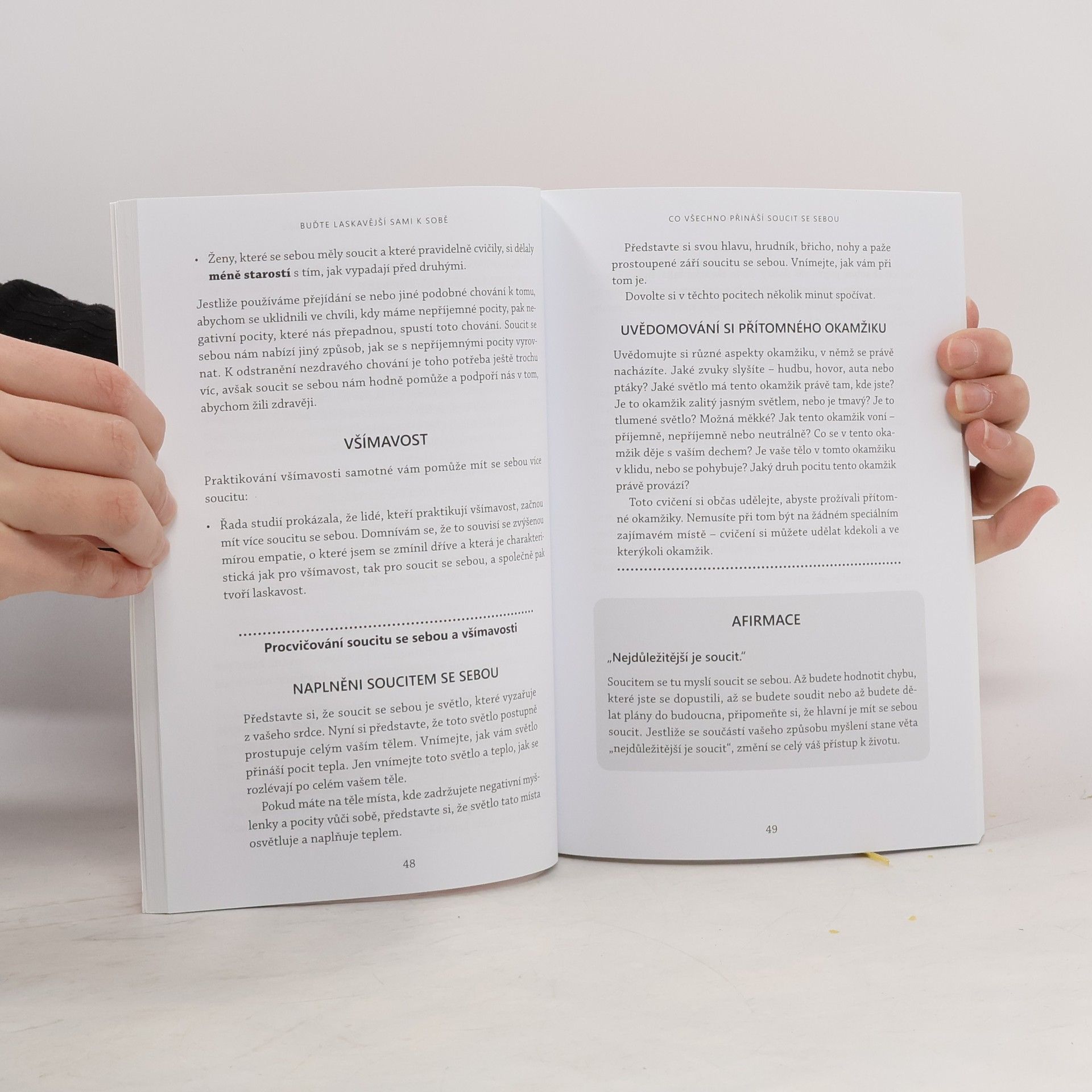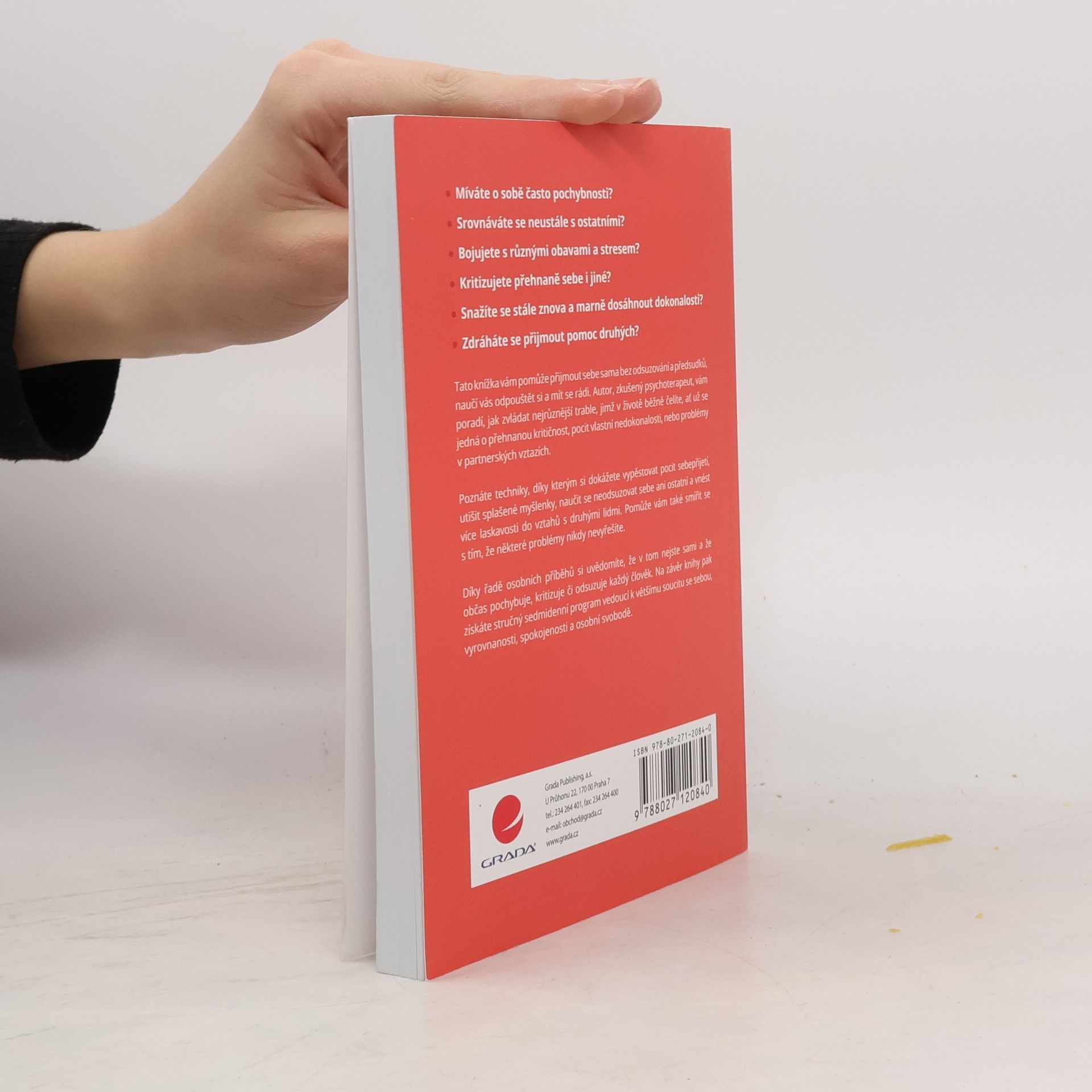 • Míváte o sobě často pochybnosti? • Srovnáváte se neustále s ostatními? • Bojujete s různými obavami a stresem? • Kritizujete přehnaně sebe i jiné? • Snažíte se stále znova a marně dosáhnout dokonalosti? • Zdráháte se přijmout pomoc druhých? Tato knížka vám pomůže přijmout sebe sama bez odsuzování a předsudků, naučí vás odpouštět si a mít se rádi. Autor, zkušený psychoterapeut, vám poradí, jak zvládat nejrůznější trable, jimž v životě běžně čelíte, ať už se jedná o přehnanou kritičnost, pocit vlastní nedokonalosti, nebo problémy v partnerských vztazích. Poznáte techniky, díky kterým si dokážete vypěstovat pocit sebepřijetí, utišit splašené myšlenky, naučit se neodsuzovat sebe ani ostatní a vnést více laskavosti do vztahů s druhými lidmi. Pomůže vám také smířit se s tím, že některé problémy nikdy nevyřešíte. Díky řadě osobních příběhů si uvědomíte, že v tom nejste sami a že občas pochybuje, kritizuje či odsuzuje každý člověk. Na závěr knihy pak získáte stručný sedmidenní program vedoucí k většímu soucitu se sebou, vyrovnanosti, spokojenosti a osobní svobodě.