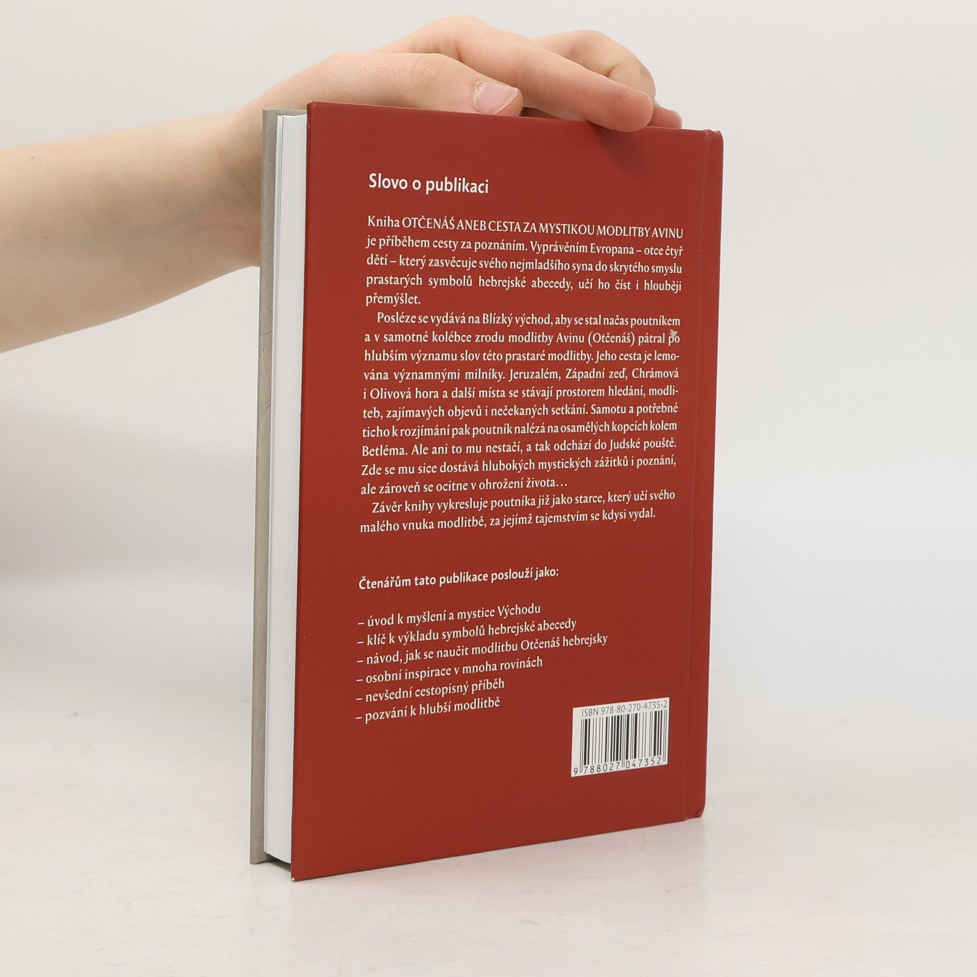 Kniha OTČENÁŠ ANEB CESTA ZA MYSTIKOU MODLITBY AVINU je příběhem cesty za poznáním. Vyprávěním Evropana - otce čtyř dětí - který zasvěcuje svého nejmladšího syna do skrytého smyslu prastarých symbolů hebrejské abecedy, učí ho číst i hlouběji přemýšlet.