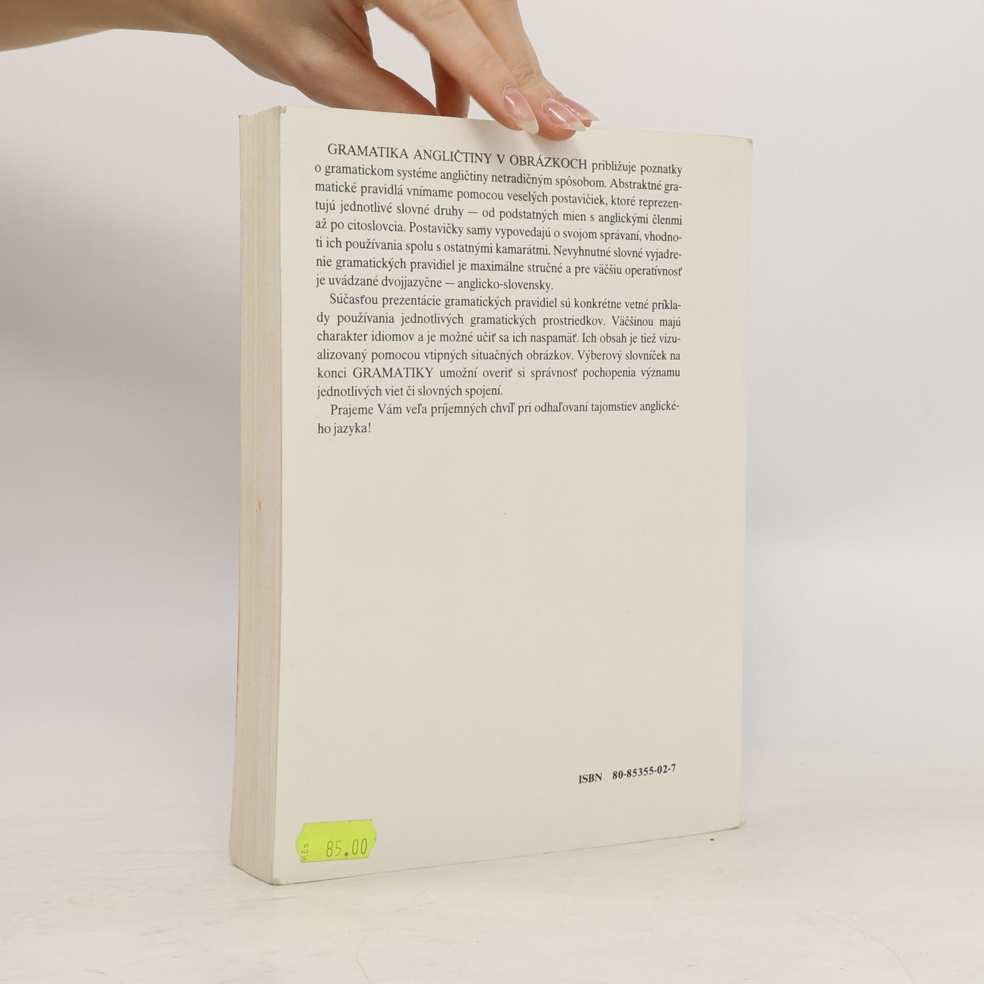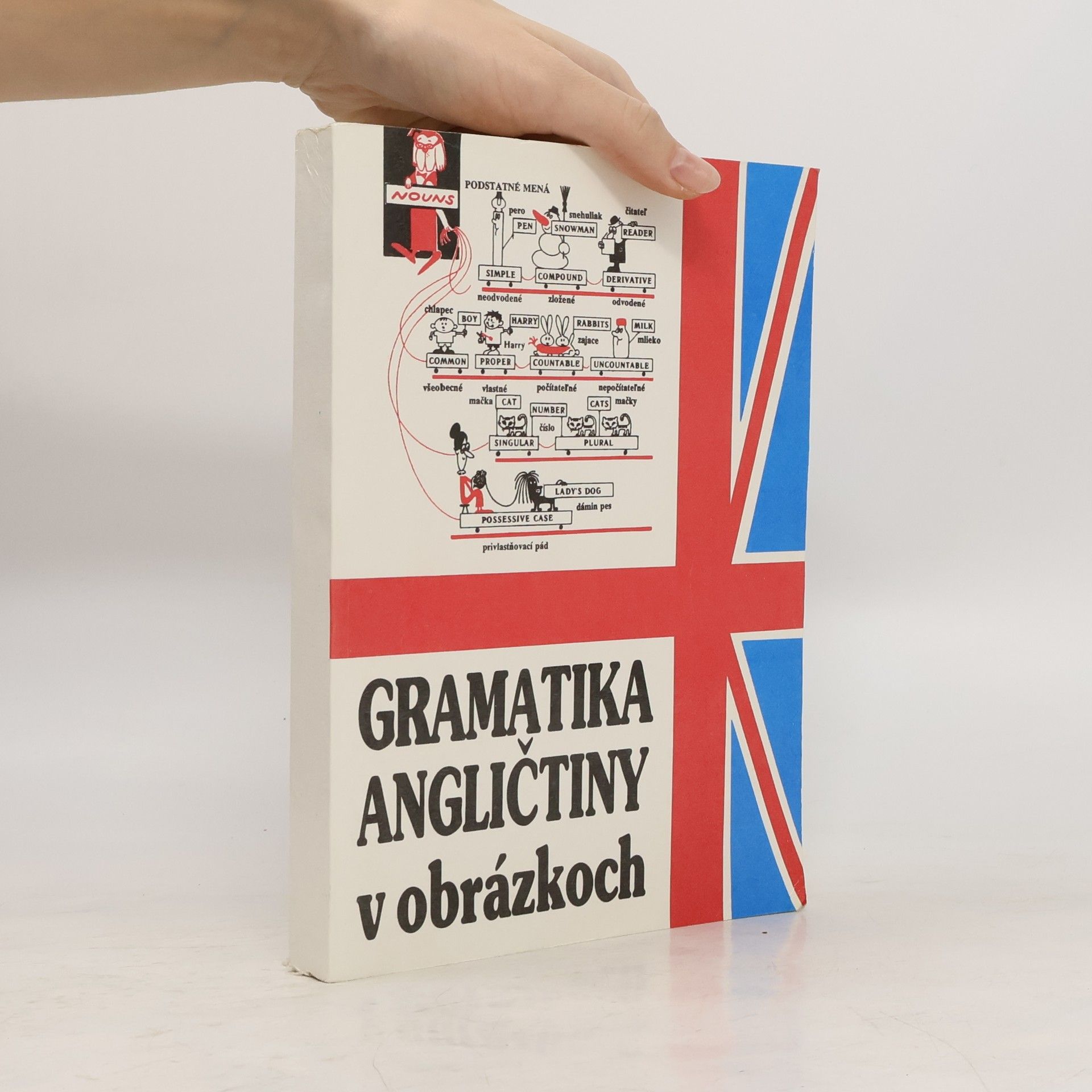 GRAMATIKA ANGLIČTINY V OBRÁZKOCH približuje poznatky o gramatickom systéme angličtiny netradičným spôsobom. Abstraktné gramatické pravidlá vnímame pomocou veselých postavičiek, ktoré reprezentujú jednotlivé slovné druhy — od podstatných mien s anglickými členmi až po citoslovcia. Postavičky samy vypovedajú o svojom správam, vhodnosti ich používania spolu s ostatnými kamarátmi. Nevyhnutné slovné vyjadrenie gramatických pravidiel je maximálne stručné a pre väčšiu operatívnosť je uvádzané dvojjazyčne — anglicko-slovensky. Súčasťou prezentácie gramatických pravidiel sú konkrétne vetné príklady používania jednotlivých gramatických prostriedkov. Väčšinou majú charakter idiomov a je možné učiť sa ich naspamäť. Ich obsah je tiež vizualizovaný pomocou vtipných situačných obrázkov. Výberový slovníček na konci GRAMATIKY umožní overiť si správnosť pochopenia významu jednotlivých viet či slovných spojem.