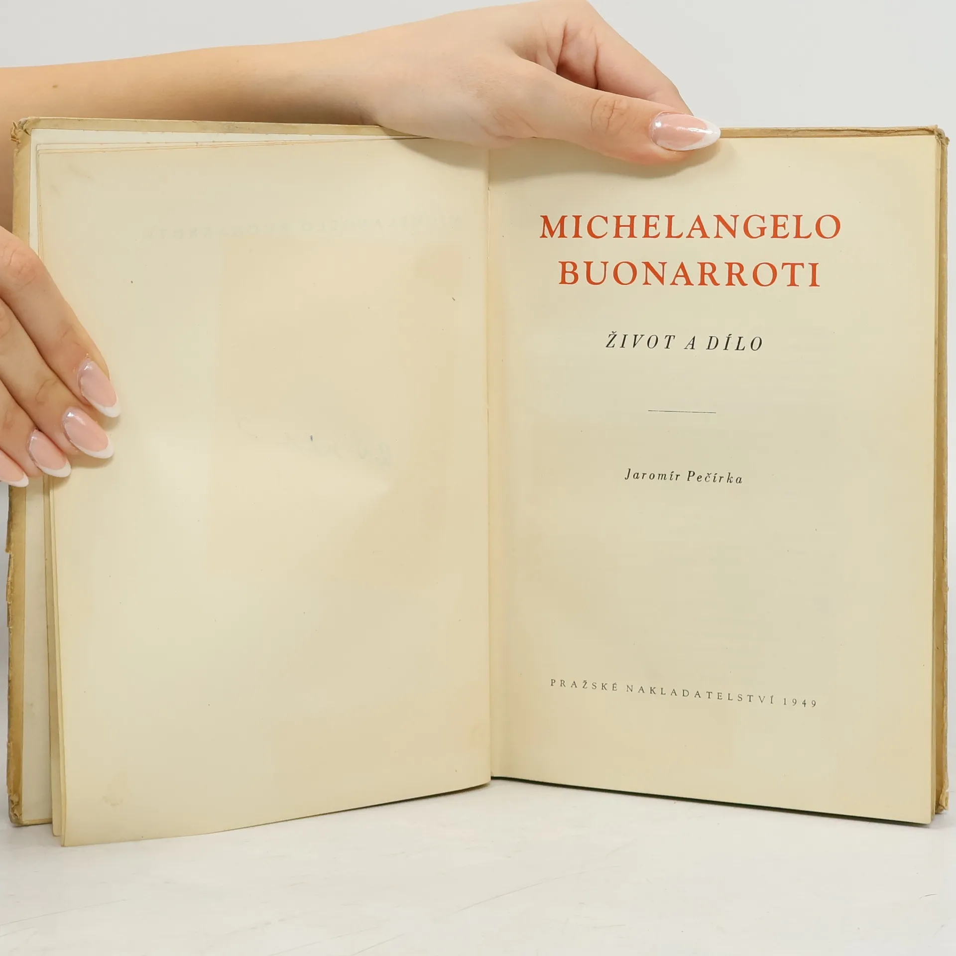 Jaromír Pečírka: Michelangelo Buonarroti - život a dílo. Jedna z nejvýznamnějších Pečírkových monografií. Kniha je napsána svěžím slohem, z něhož je znát vřelé zaujetí. Jasně i přesvědčivě poučuje o životě a osobě slavného všeumělce a vzácně přibližuje jeho osobnost cítění dnešního člověka. Vyšlo v říjnu 1942, první knižní vydání - nakladatel Václav Poláček, Praha. ČB fotografie a perokresby. Opětné vydání někdejší Topičovy knihovny, edice: Doby, postavy a díla. Řada druhá, svazek první.