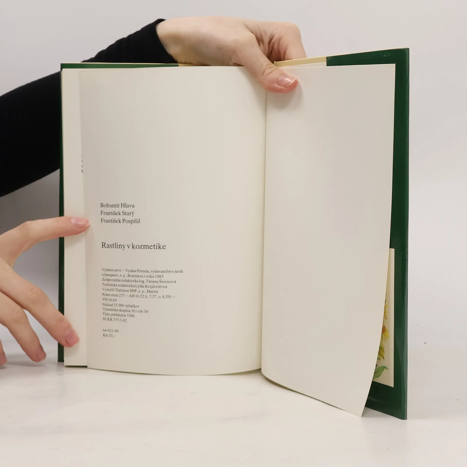 Kapitoly: Kozmetika, Krása a zdravie, Z histórie kozmetiky, Svet vôní, Ktoré časti rastlín a v akej forme sa používajú, Rastliny vo výrobe moderných kozmetických prípravkov, Účinné látky rastlín, Produkty primárneho metabolizmu, Produkty sekundárneho metabolizmu. Prvé vydanie. Cena knihy včase vydania: 33.- Kčs.