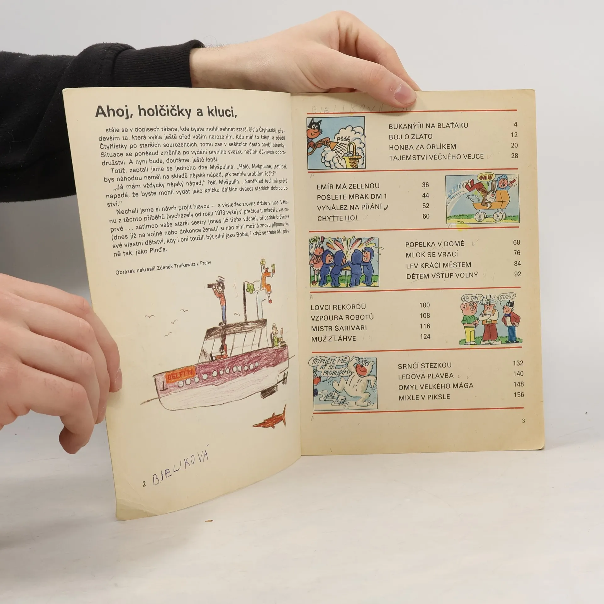 Souhrnné vydání celkem dvou desítek dobrodružství slavného Čtyřlístku obsahuje příběhy: Bukanýři na Blaťáku, Boj o zlato, Honba za Orlíkem, Tajemství věčného vejce, Emír má zelenou, Pošlete mrak DM 1, Vynález na přání, Chyťte ho!, Popelka v domě, Mlok se vrací, Lev kráčí městem, Dětem vstup volný, Lovci rekordů, Vzpoura robotů, Mistr Šarivari, Muž z láhve, Srnčí stezkou, Ledová plavba, Omyl velkého mága, Mixle v piksle.