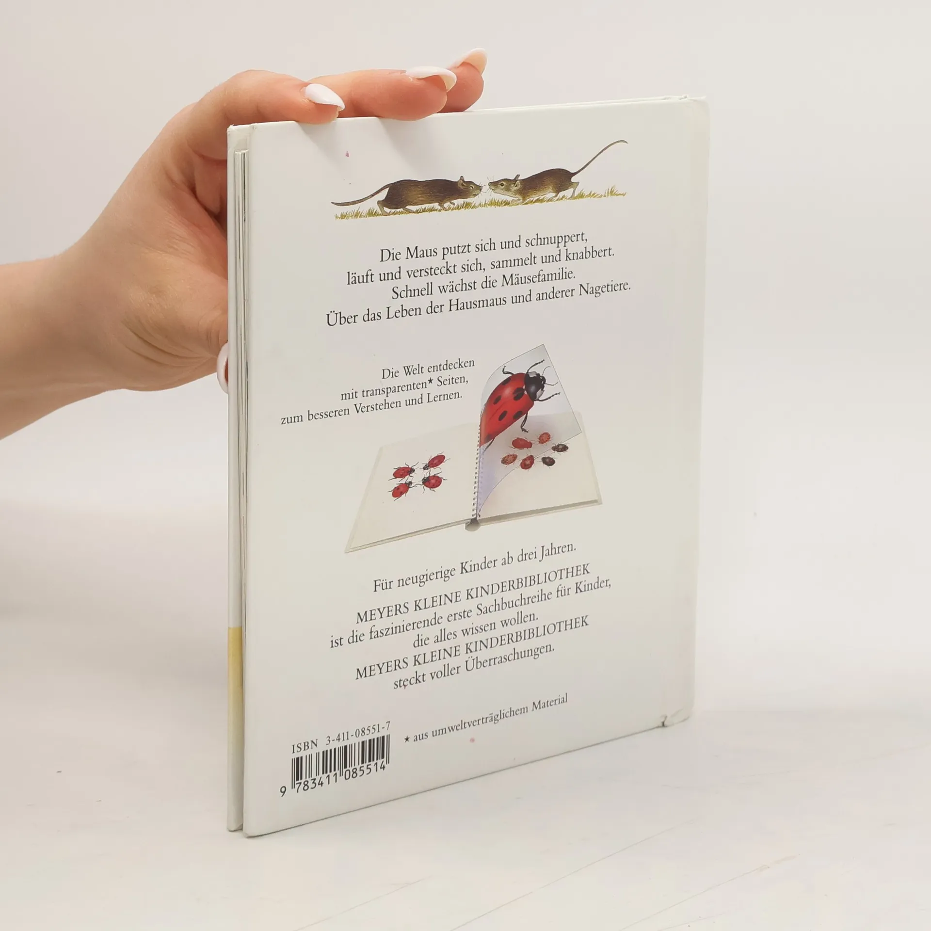 Durch spannende Effekte vermittelt die Bilderbuchreihe „Meyers kleine Kinderbibliothek“ erstes Sachwissen für Kinder ab 3 Jahren. Transparente Folien zeigen beim Umblättern das Innenleben von Dingen, machen Verdecktes sichtbar oder veranschaulichen Veränderungen. In diesem Band können die Kleinen das Leben einer Hausmaus und anderer Nagetiere kennenlernen. Sie können beobachten, wie diese schnuppern und sich putzen, wie sie sich verstecken, Nahrung sammeln und knabbern, und wie schnell eine Mäusefamilie wächst!