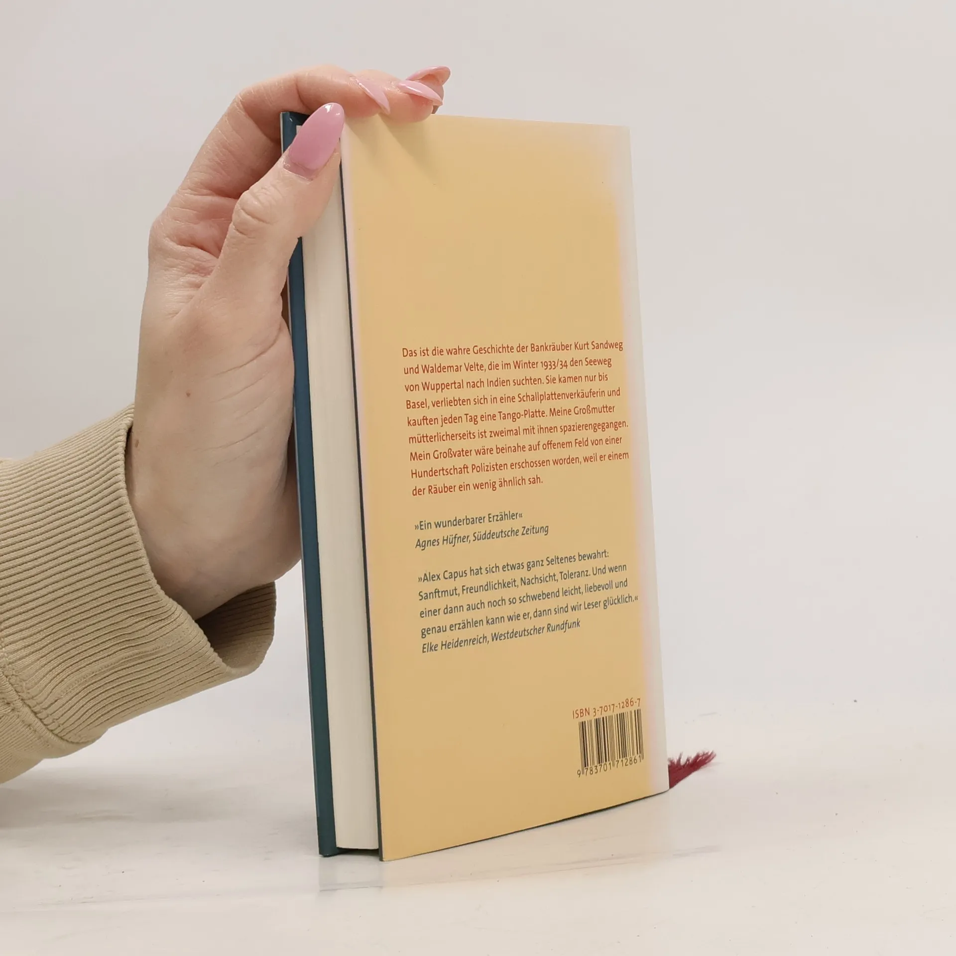 Die wahre Geschichte der Bankräuber Kurt Sandweg und Waldemar Velte, die im Winter 1933/34 den Seeweg von Wuppertal nach Indien suchten. Sie kamen nur bis Basel, verliebten sich in eine Schallplattenverkäuferin und kauften jeden Tag eine Tango-Platte. Zwei arbeitslose junge Burschen wollen 1933 aus Nazideutschland fliehen. Um sich das Reisegeld zu beschaffen, überfallen sie eine Bank, wobei sie versehentlich den Filialleiter erschießen. Auf der Flucht in den Süden kommen sie nicht weit: In Basel verliebt sich der eine in eine Schallplattenverkäuferin. Tag für Tag kauft er eine Tango-Platte, bis das Geld aufgebraucht ist und der nächste Banküberfall nötig wird. Abend für Abend gehen die drei am Rhein spazieren. Mit von der Partie ist eine junge Sportartikelverkäuferin, die dreißig Jahre später die Großmutter des Erzählers sein wird und die sich entscheiden muß zwischen einem Bankräuber und ihrem Verlobten. Alex Capus hat diese authentische Geschichte um Freundschaft und Treue, Liebe und Verrat akribisch recherchiert – in Polizei- und Zeitungsarchiven, in Gesprächen mit Überlebenden, auf langen Wanderungen an den Orten des Geschehens. Entstanden ist ein Roman wie ein Tango: leicht und schwermütig, frisch und elegant und voller Trauer um verpaßte Möglichkeiten und zerronnenes Glück.