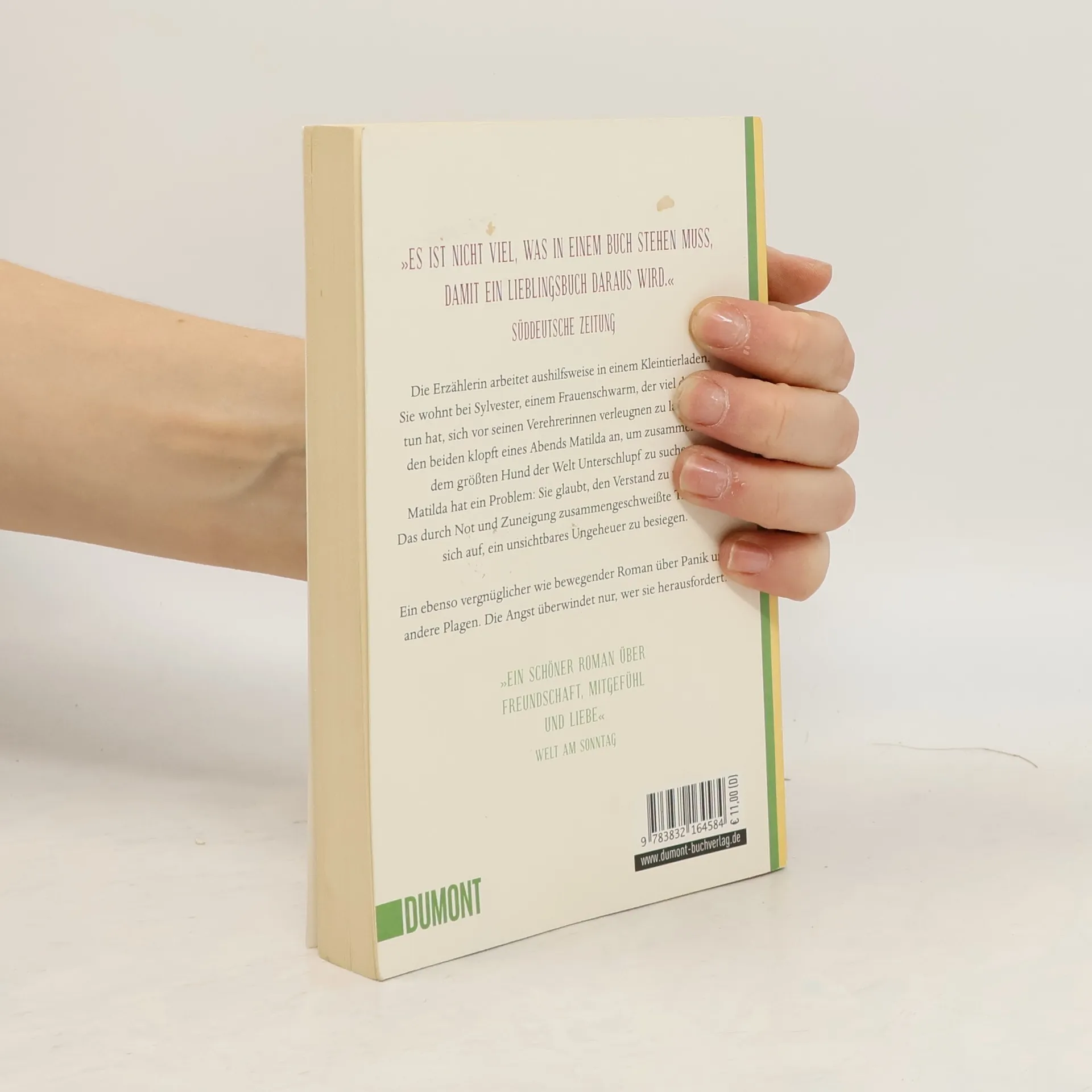Die Erzählerin arbeitet aushilfsweise in einem Kleintierladen. Sie wohnt bei Sylvester, einem Frauenschwarm, der viel damit zu tun hat, sich vor seinen Verehrerinnen verleugnen zu lassen. Bei den beiden klopft eines Abends Matilda an, um zusammen mit dem größten Hund der Welt Unterschlupf zu suchen. Matilda hat ein Problem: Sie glaubt, den Verstand zu verlieren. Das durch Not und Zuneigung zusammengeschweißte Trio macht sich auf, ein unsichtbares Ungeheuer zu besiegen. Mariana Leky gelingt es, diesen Kampf gegen schwindelerregende Windmühlenflügel klingen zu lassen wie eine Filmkomödie: ein ebenso vergnüglicher wie bewegender Roman über Panik und andere Plagen. Die Angst überwindet nur, wer sie herausfordert.