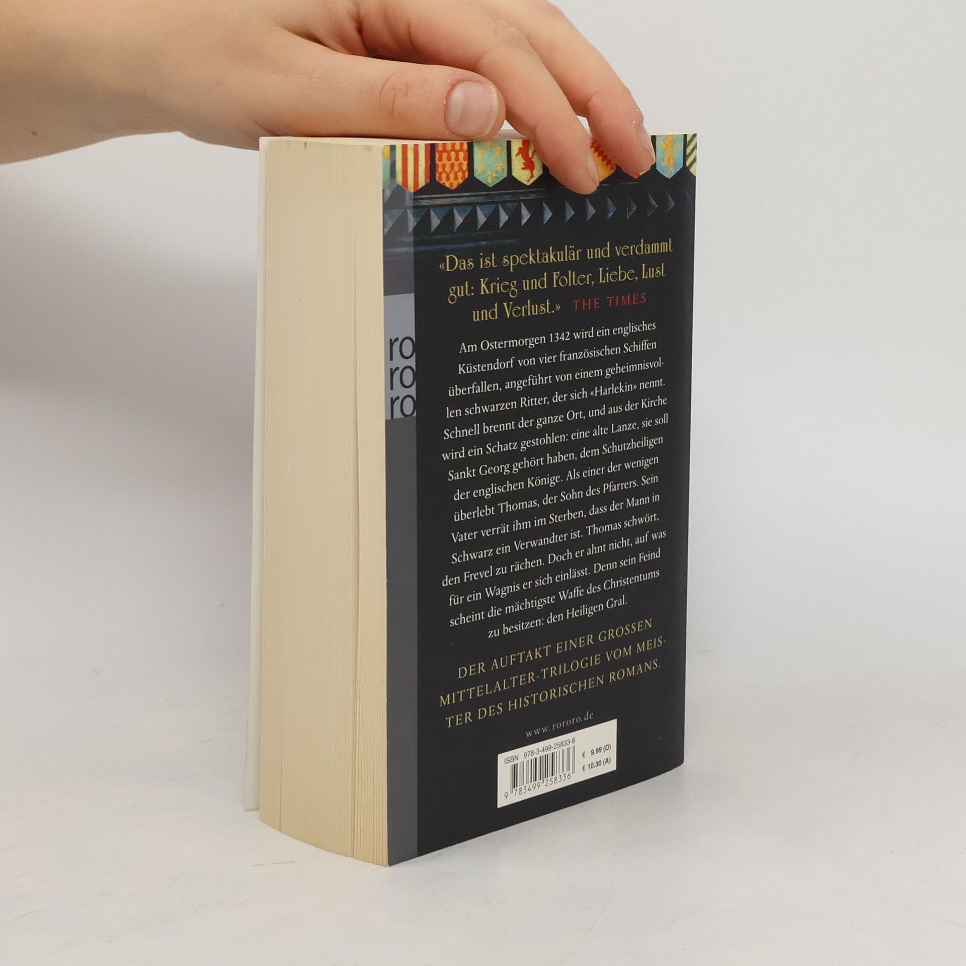 Am Ostermorgen 1342 wird ein englisches Küstendorf von vier französischen Schiffen überfallen, angeführt von einem geheimnisvollen schwarzen Ritter, der sich «Harlekin» nennt. Schnell brennt der ganze Ort, und aus der Kirche wird ein Schatz gestohlen: eine alte Lanze, sie soll Sankt Georg gehört haben, dem Schutzheiligen der englischen Könige. Als einer der wenigen überlebt Thomas, der Sohn des Pfarrers. Sein Vater verrät ihm im Sterben, dass der Mann in Schwarz ein Verwandter ist. Thomas schwört, den Frevel zu rächen. Doch er ahnt nicht, auf was für ein Wagnis er sich einlässt. Denn sein Feind scheint die mächtigste Waffe des Christentums zu besitzen: den Heiligen Gral. DER AUFTAKT EINER GROSSEN MITTELALTER-TRILOGIE VOM MEISTER DES HISTORISCHEN ROMANS Die Bücher vom Heiligen Gral, Band 1