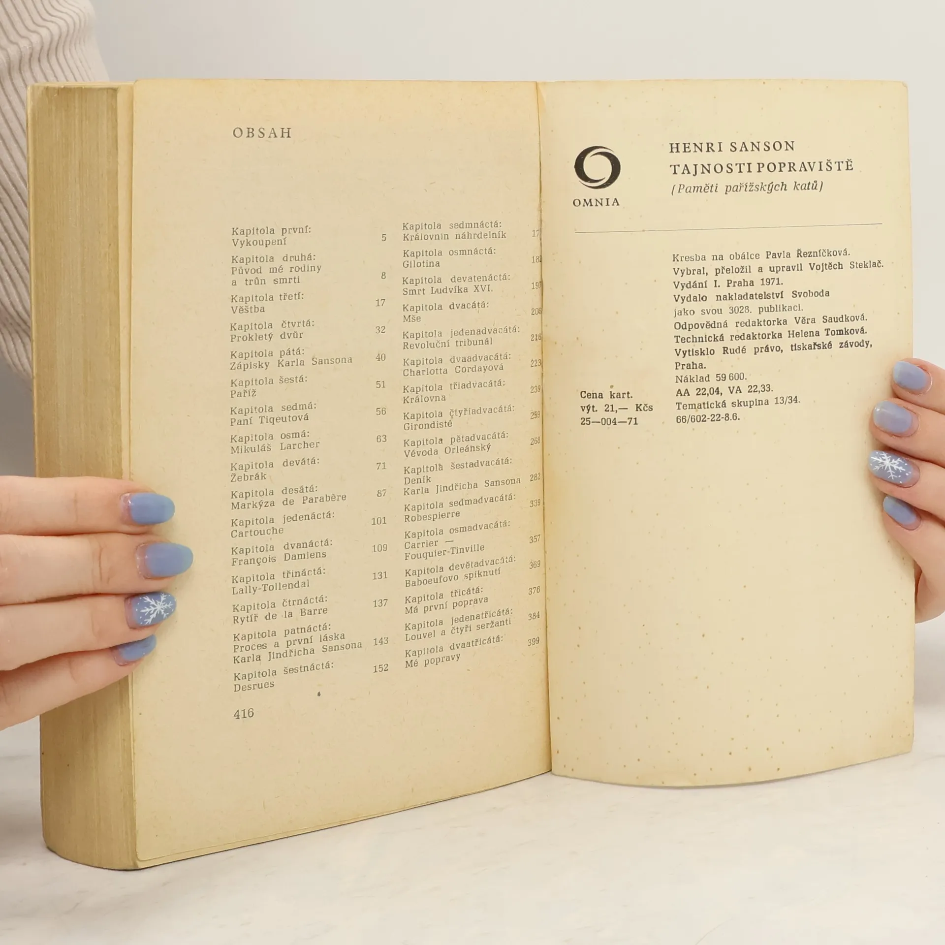 Historie rodu francouzských katů Sansonů, rodu, jehož příslušníci tento úřad vykonávali od konce 17. do poloviny 19. století. Kniha, v níž poslední potomek rodu v tomto úřadu, popravčí mistr soudního dvora v Paříži, po složení úřadu líčí podle rodových zápisů na pozadí historických událostí soukromý život i drastické zážitky jednotlivých členů rodu a uzavírá je pamětmi vlastními 25-004-71