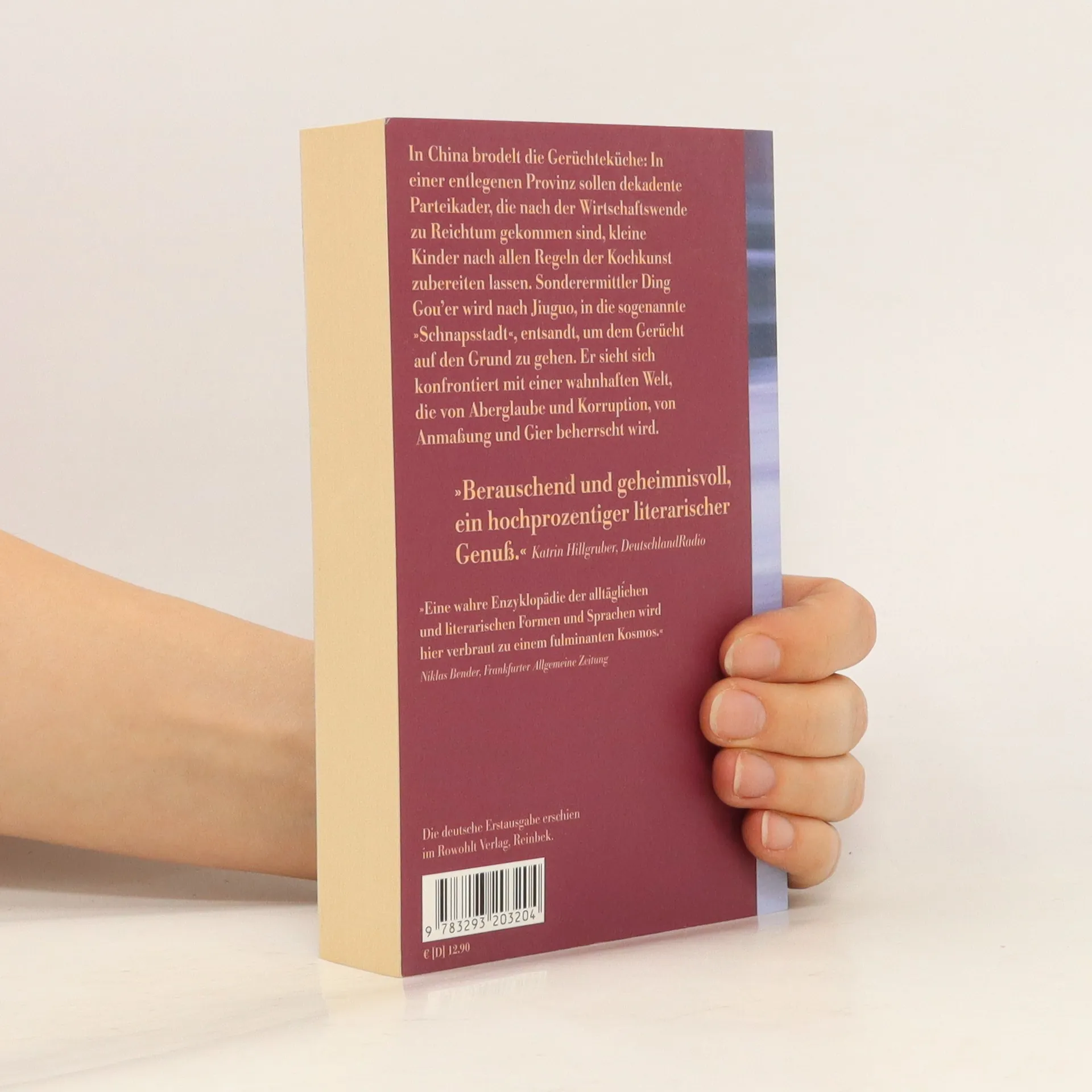 In China brodelt die Gerüchteküche: In einer entlegenen Provinz sollen dekadente Parteikader, skrupellose Parvenüs, die nach der Wirtschaftswende zu Reichtum gekommen sind, kleine Kinder nach allen Regeln der Kochkunst zubereiten lassen. Sonderermittler Ding Gou’er wird nach Jiuguo, in die sogenannte »Schnapsstadt«, entsandt, um der Fama dieser »Fleischkinder« auf den Grund zu gehen. Doch kaum hat Ding den Fall aufgegriffen, sieht er sich konfrontiert mit einer wahnhaften Welt, die von Aberglaube und Korruption, von Anmaßung und Gier beherrscht wird. Die Schnapsstadt ist eine virtuose Groteske, eine politische Allegorie, die das neue China der toten Ideale und seine gesellschaftliche Wirklichkeit kühn gegen den Strich bürstet.