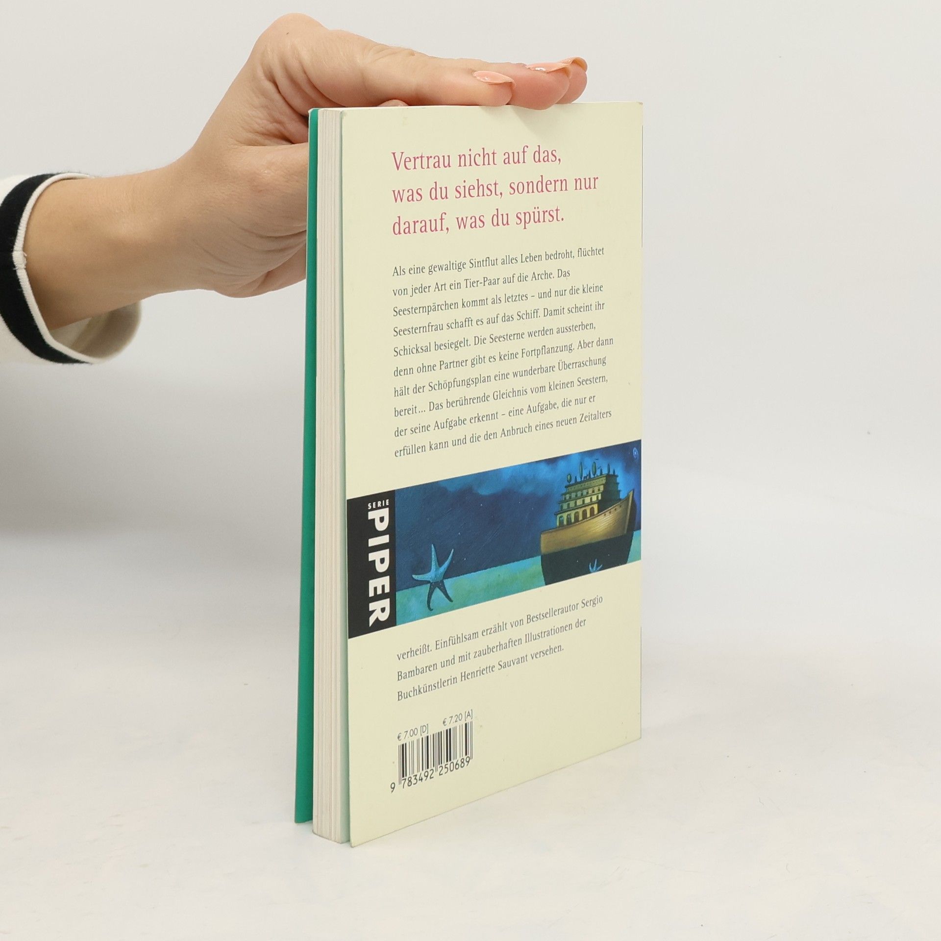 Als eine gewaltige Sintflut alles Leben bedroht, flüchtet von jeder Art ein Tierpaar auf die Arche. Das Seesternpärchen kommt als letztes – und nur die kleine Seesternfrau schafft es auf das Schiff. Damit scheint ihr Schicksal besiegelt. Die Seesterne werden aussterben, denn ohne Partner gibt es keine Fortpflanzung. Aber dann hält der Schöpfungsplan eine wunderbare Überraschung bereit … Für jeden von uns ist ein Platz im Universum bestimmt: das berührende Gleichnis vom kleinen Seestern, der seine Aufgabe erkennt – eine Aufgabe, die nur er erfüllen kann und die den Anbruch eines neuen Zeitalters verheißt. Einfühlsam erzählt von Bestsellerautor Sergio Bambaren und mit zauberhaften Illustrationen der Buchkünstlerin Henriette Sauvant versehen.