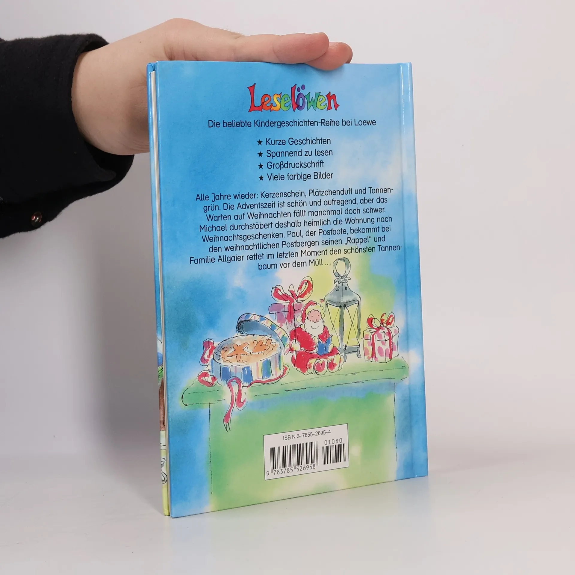 Lesealter ab 8 4. Stufe der Loewe-Leseleiter Kurze Geschichten Großdruckschrift Alle Jahre wieder: Kerzenschein, Plätzchenduft und Tannengrün. Die Adventszeit ist schön und aufregend, aber das Warten auf Weihnachten fällt manchmal doch schwer. Michael durchstöbert deshalb heimlich die Wohnung nach Weihnachtsgeschenken. Paul, der Postbote, bekommt bei den weihnachtlichen Postbergen seinen „Rappel“ und Familie Allgaier rettet im letzten Moment den schönsten Tannenbaum vor dem Müll.