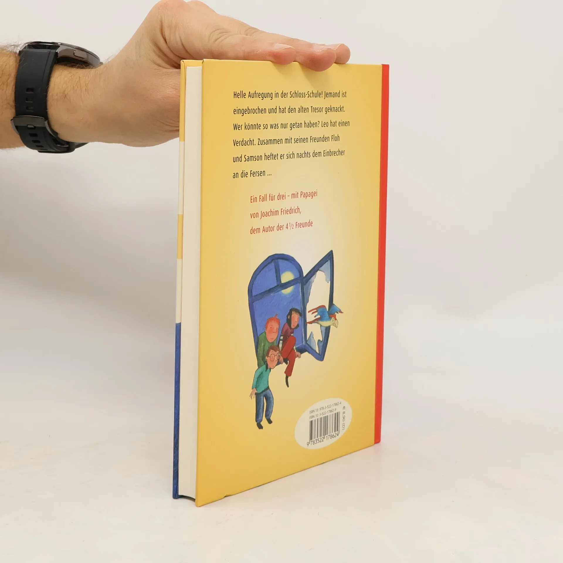 Helle Aufregung in der Schloss-Schule! Jemand ist eingebrochen und hat den alten Tresor geknackt. Wer könnte so was nur getan haben? Leo hat einen Verdacht. Zusammen mit seinen Freunden Floh und Samson verfolgt er mitten in der Nacht eine heiße Spur. „Ein Fall für drei - mit Papagei“: die neue Serie von Joachim Friedrich, dem Autor der 4 ½ Freunde Ab 8 Jahren