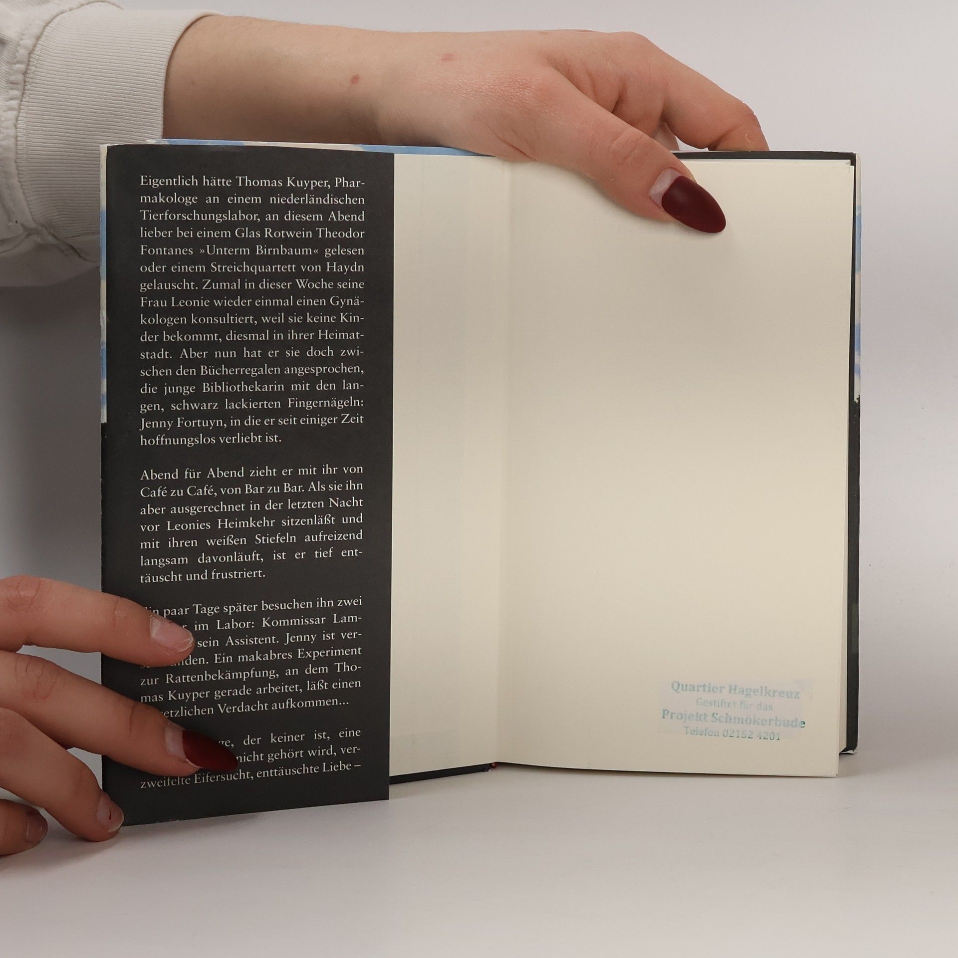 Jenny mit den schwarz lackierten langen Fingernägeln verschwindet, und natürlich gerät unter Verdacht, wer zuletzt mit ihr gesehen wurde: Thomas Kuyper, Pharmakologe in einem Tierforschungslabor. Seine Frau war eine Woche verreist, er hatte nicht der Versuchung widerstanden – nun sieht sich Thomas mit den Scherben seiner Ehe und seiner Existenz konfrontiert. Grandios komponiert der Bestsellerautor Maarten ’t Hart die Themen Liebe, Ehe, Eifersucht und möglicherweise Mord zu einem ungemein fesselnden Roman.