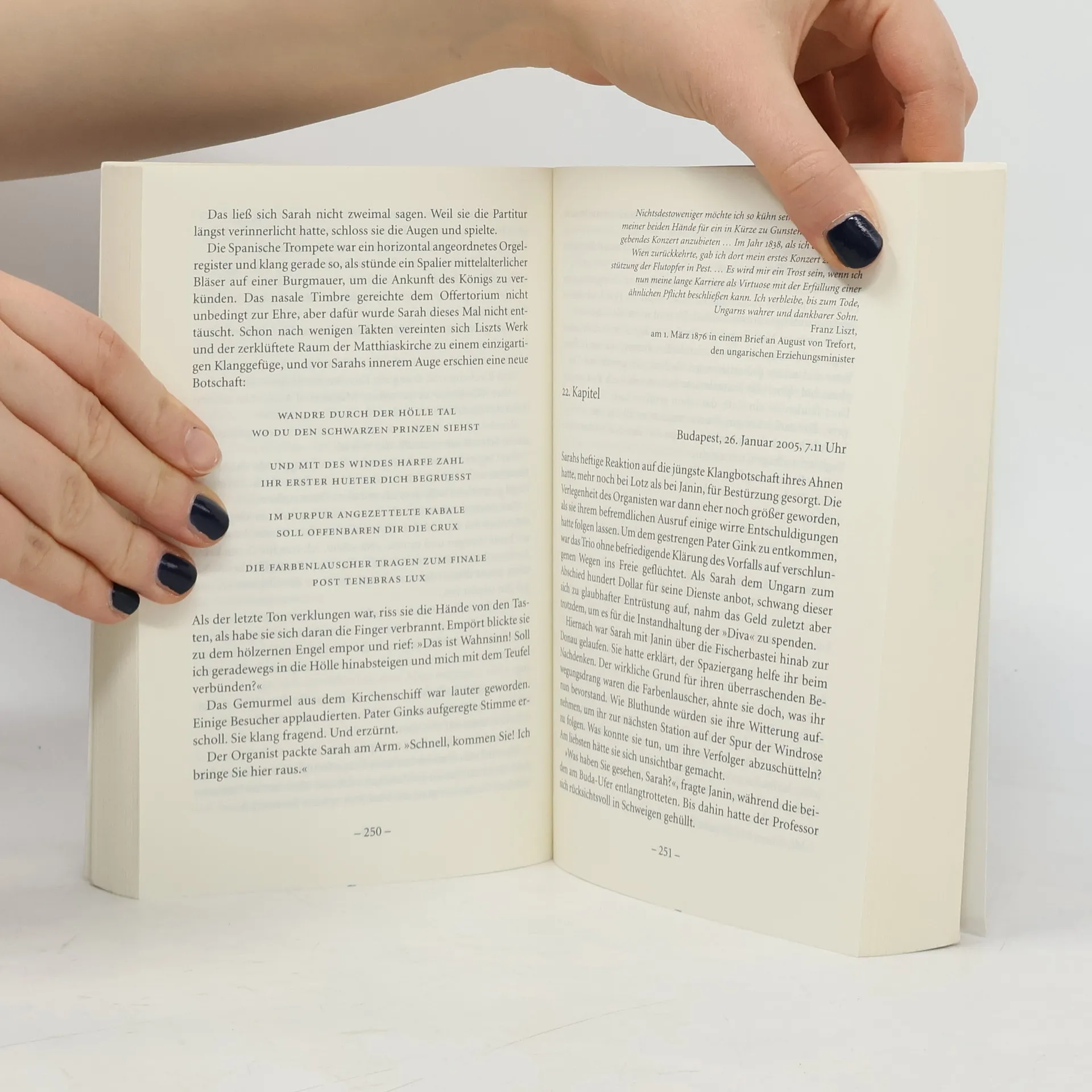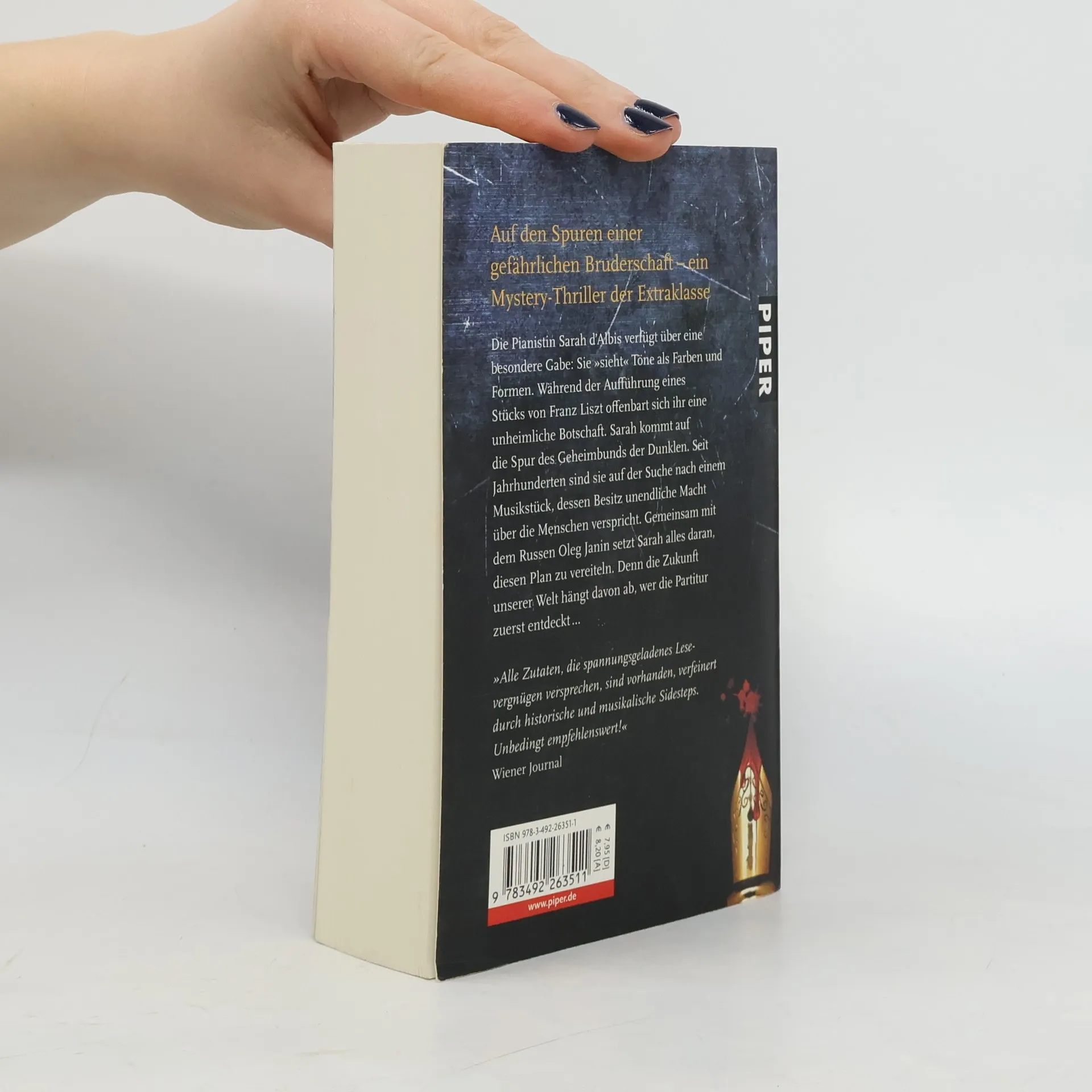 Die Pianistin Sarah d’Albis verfügt über eine besondere Gabe: Sie „sieht“ Töne als Farben und Formen. Während der Aufführung eines Stücks von Franz Liszt offenbart sich ihr eine unheimliche Botschaft. Sarah kommt auf die Spur des Geheimbunds der Dunklen. Seit Jahrhunderten sind sie auf der Suche nach einem Musikstück, dessen Besitz unendliche Macht über die Menschen verspricht. Gemeinsam mit dem Russen Oleg Janin setzt Sarah alles daran, um diesen Plan zu vereiteln. Denn die Zukunft unserer Welt hängt davon ab, wer die Partitur zuerst entdeckt …