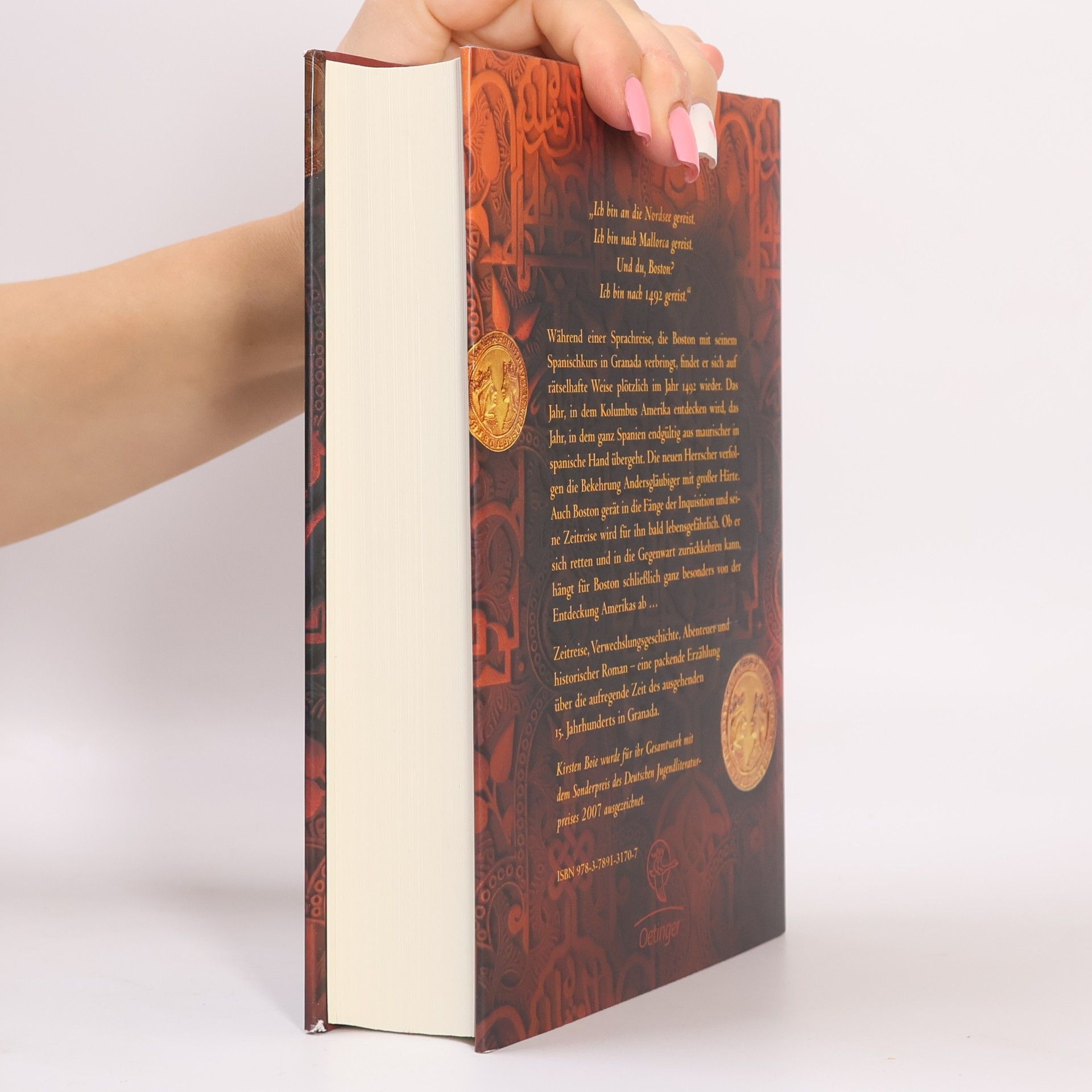 Granada, 1492. Ein Tor in der Zeit und plötzlich verändert sich die Welt …Gerade war Boston noch mit seinen Mitschülern auf dem arabischen Seidenmarkt in Granada. Plötzlich ist alles anders: Durch ein Tor in der Zeit ist Boston im Jahr 1492 gelandet. Dort wird es für ihn lebensgefährlich. Er erweckt Misstrauen am spanischen Königshof und auf der Alhambra gerät er in die grausamen Fänge der Inquisition. Doch zwei neue Freunde, Tariq und Salomon, als Muslim und Jude selbst bedroht, stehen ihm in dieser fast ausweglosen Situation bei. Aber die Rückkehr Bostons hängt nicht nur davon ab, ob er den Schlüssel zur Gegenwart findet, sondern auch von der Entdeckung Amerikas …