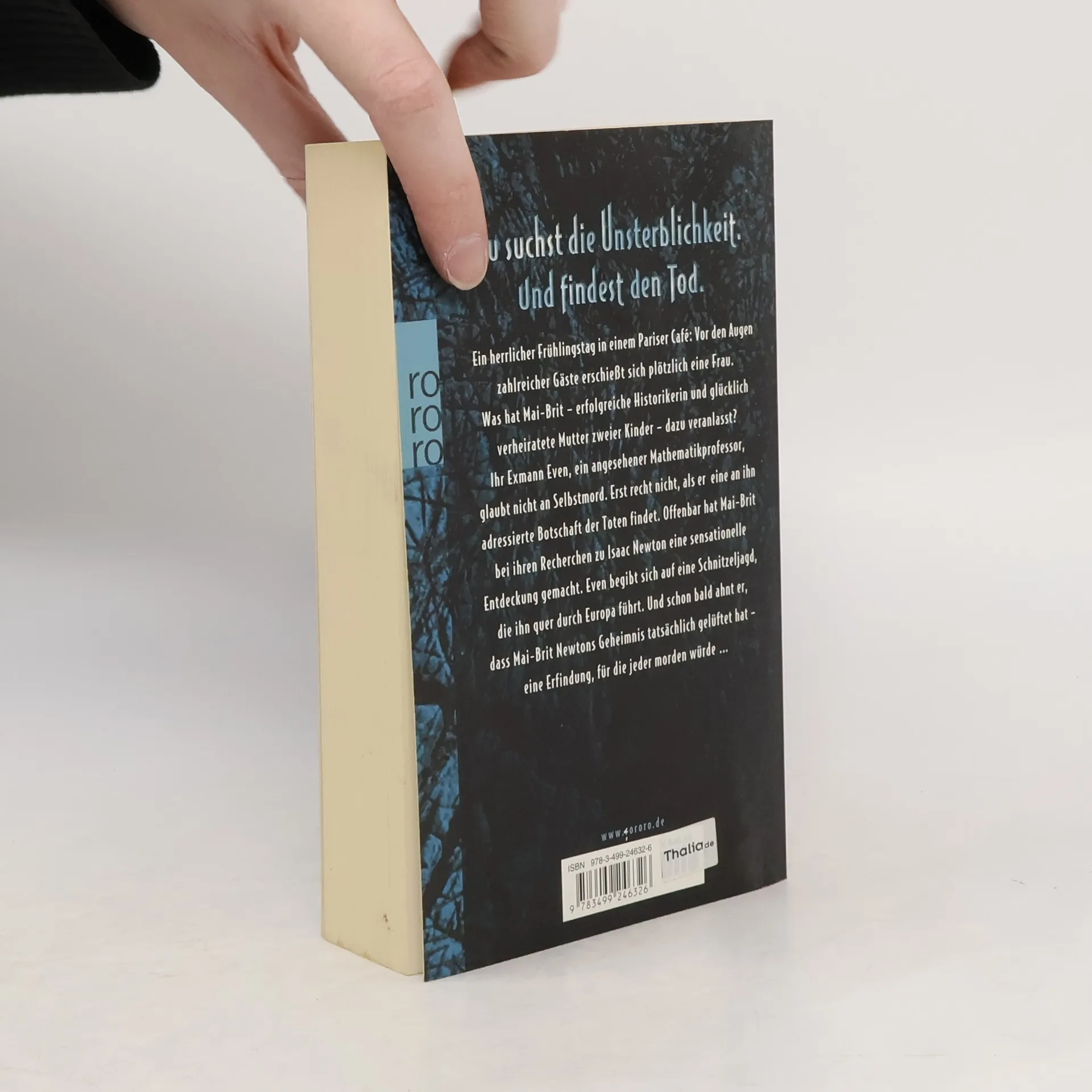 Du suchst die Unsterblichkeit. Und findest den Tod. Ein herrlicher Frühlingstag in einem Pariser Café: Vor den Augen zahlreicher Gäste erschießt sich plötzlich eine Frau. Was hat Mai-Brit – erfolgreiche Historikerin und glücklich verheiratete Mutter zweier Kinder – dazu veranlasst? Ihr Ex-Mann Even, ein angesehener Mathematik-Professor, glaubt nicht an Selbstmord. Erst recht nicht, als er eine an ihn adressierte Botschaft der Toten findet. Offenbar hat Mai-Brit bei ihren Recherchen zu Isaac Newton eine sensationelle Entdeckung gemacht. Even begibt sich auf eine Schnitzeljagd, die ihn quer durch Europa führt. Und schon bald ahnt er, dass Mai-Brit Newtons Geheimnis tatsächlich gelüftet hat – eine Erfindung, für die jeder morden würde …