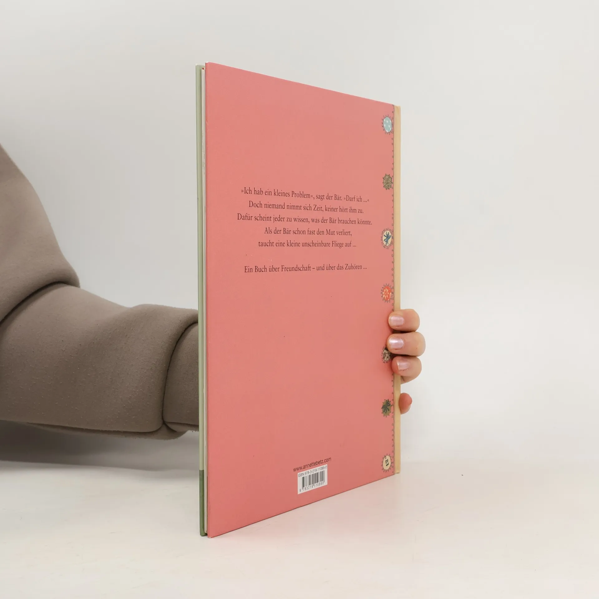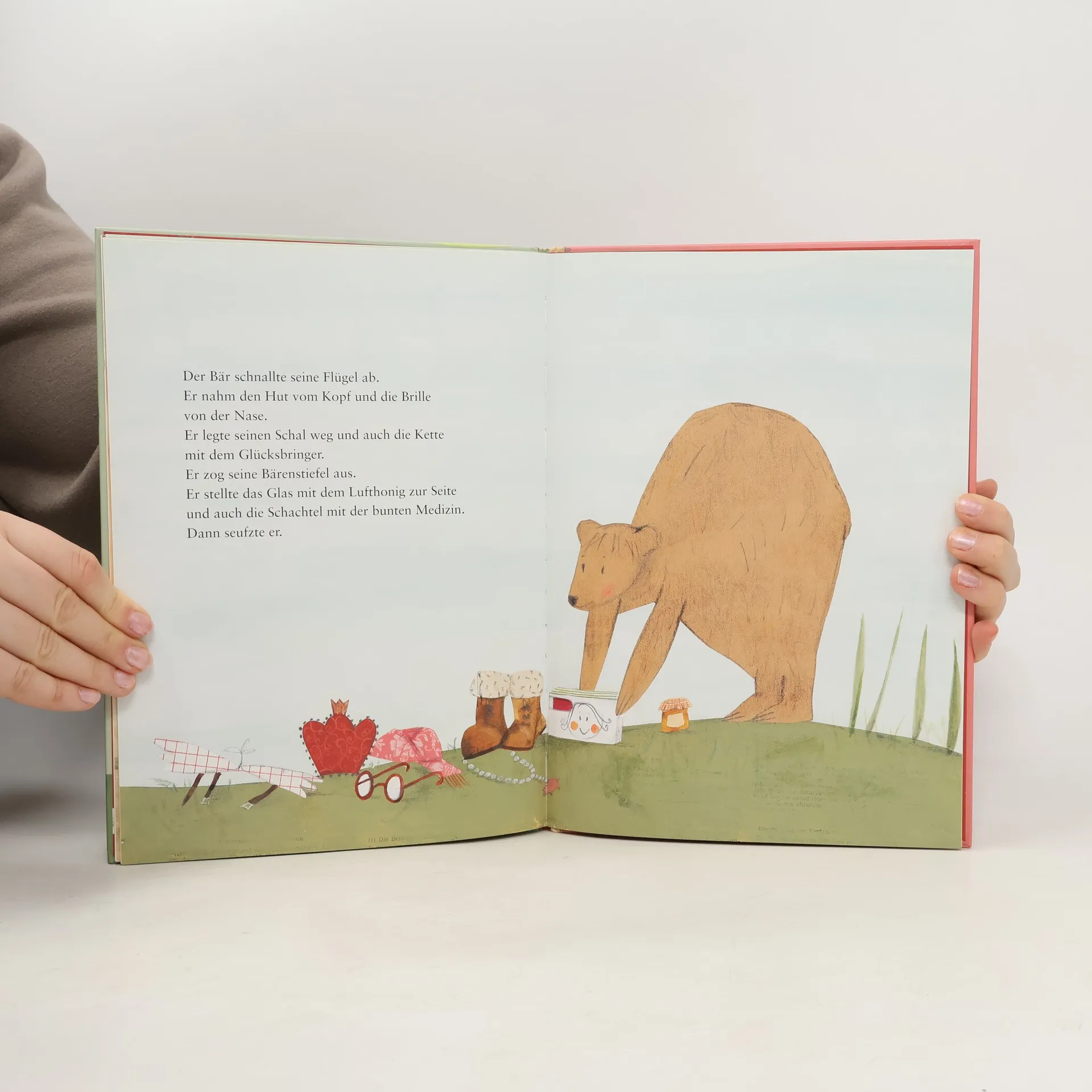 Der Bär hat ein kleines Problem, aber jeder, dem er davon erzählen will, hat schon vorher eine Lösung für ihn: Vom Schneider bekommt er einen Schal, vom Erfinder Flügel und vom Arzt Tabletten - doch es interessiert niemanden, was der Bär eigentlich möchte. Bis der Bär die kleine Fliege trifft, die ihm endlich zuhört.