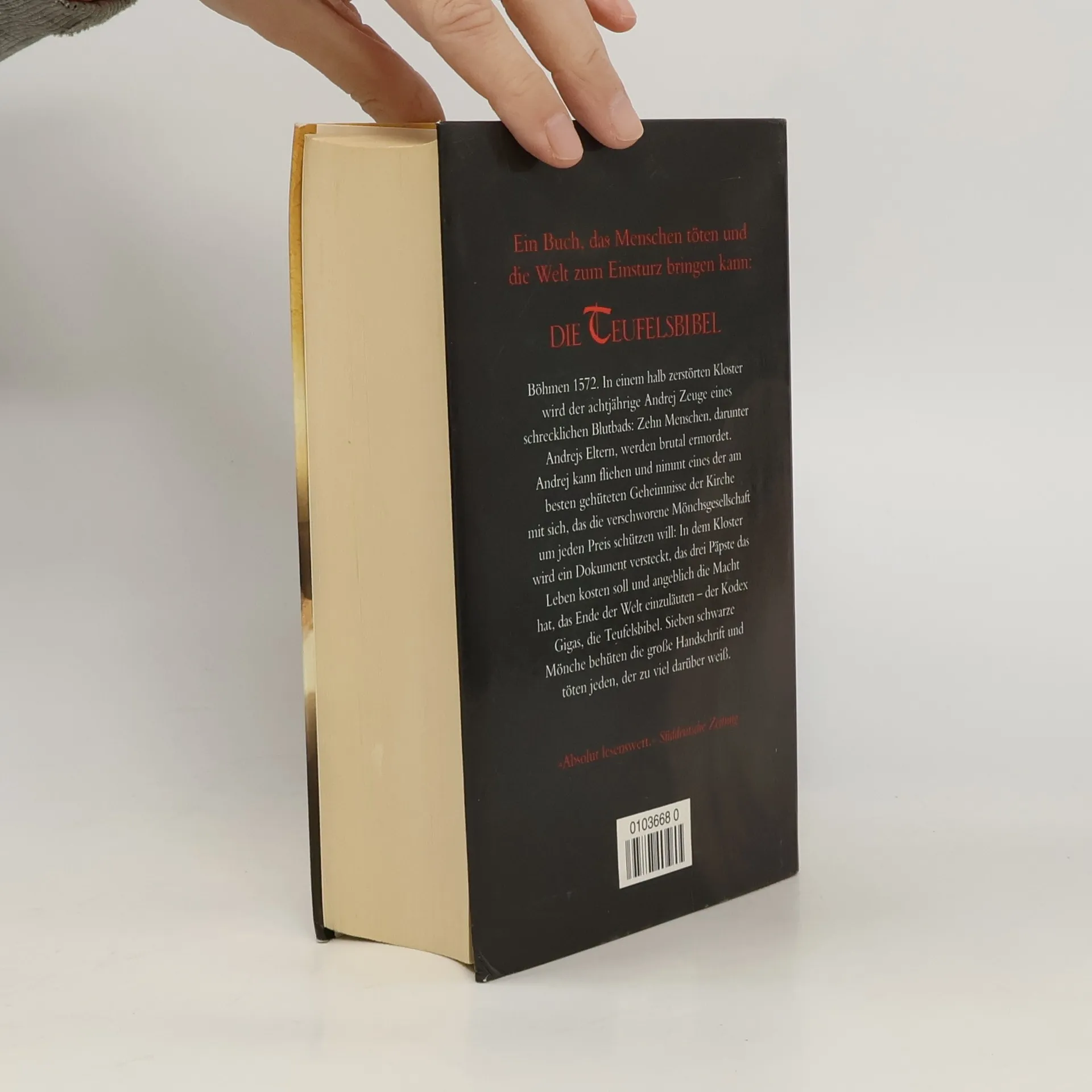 Böhmen 1572. In einem halb verfallenen Kloster wird der achtjährige Andrej Zeuge eines schrecklichen Blutbads: Zehn Menschen, darunter Andrejs Eltern, werden von einem rasenden Mönch brutal ermordet. Eine der Frauen bringt sterbend ein Kind zur Welt. Der Prior befiehlt, auch den Säugling zu töten - denn es gilt, alle Spuren zu verwischen, die irgendjemanden in das abgelegene Kloster führen könnten. Andrej kann fliehen und nimmt eines der am besten gehüteten Geheimnisse der Kirche mit sich, das die verschwiegene Mönchsgesellschaft um jeden Preis zu schützen geschworen hat: In dem Kloster wird ein Buch versteckt, das drei Päpsten das Leben kosten und die Macht haben soll, das Ende der Welt einzuläuten - der Codex Gigas, die Teufelsbibel, ein Kompendium des Bösen. Sieben schwarze Mönche behüten die große Handschrift und töten jeden, der zuviel darüber weiß. Doch das Wissen um das Buch des Teufels ist das einzige Erbe, das Andrej von seinem Vater geblieben ist ...