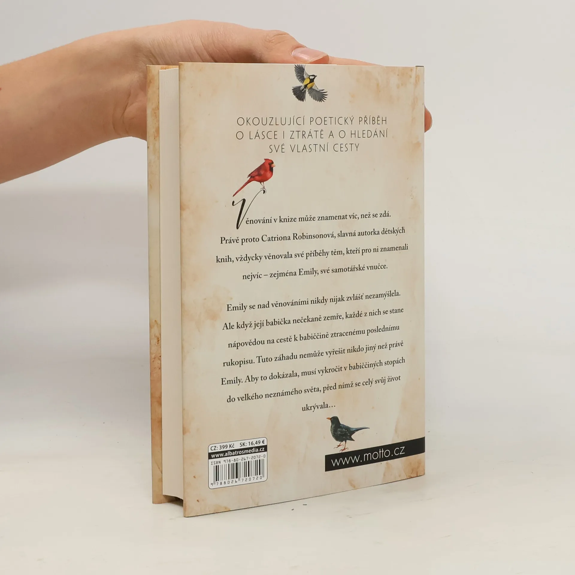 Někdy potřebuješ jen trochu popostrčit… Okouzlující poetický příběh o lásce i ztrátě a o hledání své vlastní cesty Věnování v knize může znamenat víc, než se zdá. Právě proto Catriona Robinsonová, slavná autorka dětských knih, vždycky věnovala své příběhy těm, kteří pro ni znamenali nejvíc – zejména Emily, své samotářské vnučce. Emily se nad věnováními nikdy nijak zvlášť nezamýšlela. Ale když její babička nečekaně zemře, každé z nich se stane nápovědou na cestě k babiččině ztracenému poslednímu rukopisu. Tuto záhadu nemůže vyřešit nikdo jiný než právě Emily. Aby to dokázala, musí vykročit v babiččiných stopách do velkého neznámého světa, před nímž se celý svůj život ukrývala…