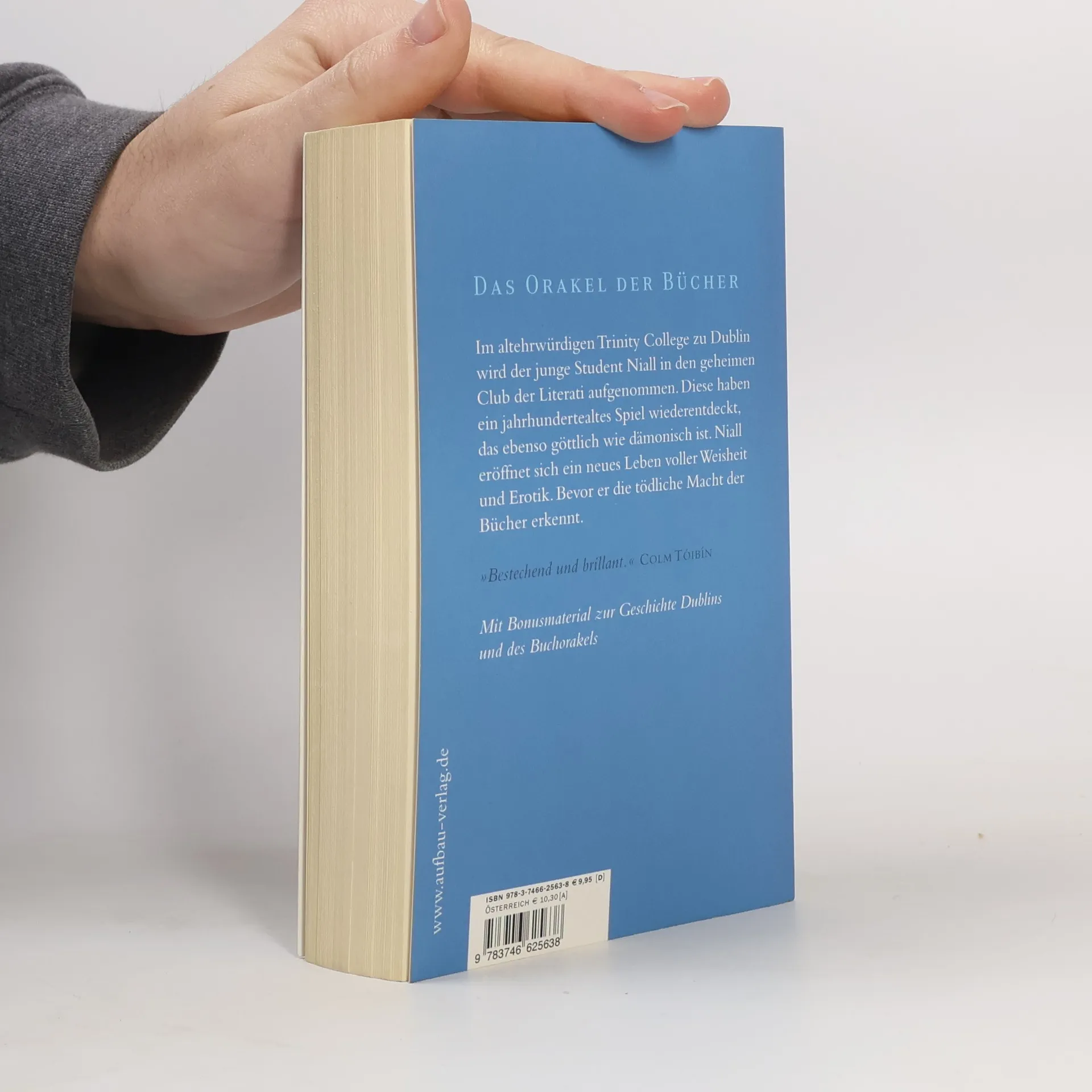 Das Orakel der Bücher Im altehrwürdigen Trinity College zu Dublin wird der junge Student Niall in den geheimen Club der Literati aufgenommen. Diese haben ein jahrhundertealtes Spiel wiederentdeckt, das ebenso göttlich wie dämonisch ist. Niall eröffnet sich ein neues Leben voller Weisheit und Erotik. Bevor er die tödliche Macht der Bücher erkennt. „Bestechend und brillant.“ Colm Tóibín „Eine Verneigung vor der Welt der Literatur“ NDR Als Niall Lenihan sein Studium im Trinity College zu Dublin antritt, ändert sich sein Leben auf magische Weise. Er trifft Studenten, die des Nachts in alten Büchern lesen, als ginge es um ihre Seelen. Es sind „Literati“, Angehörige eines verborgenen Ordens, die einem alten Kult frönen: Mit Hilfe von sogenannten „Sortes“ – schicksalsschweren Textstellen aus alten Büchern – sind sie der Zukunft und dem Mysterium des Lebens auf der Spur. Niall verfällt den Literati und den Sortes. Zu spät merkt er, dass sie sein Leben gefährden. Mit Bonusmaterial zur Geschichte Dublins und des Buchorakels