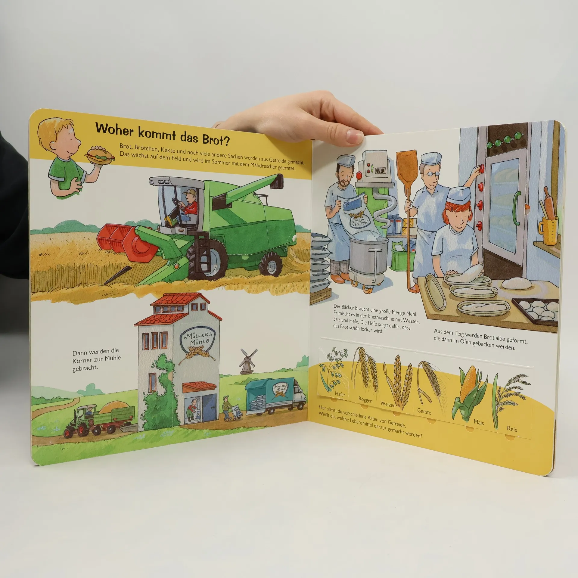 Vom Korn zum Brot: erstes Basiswissen für eine gesunde Ernährung Lecker, dieses Frühstücksei! Aber woher kommt es? Wer liefert die Milch und was braucht man zum Brotbacken? Jedes Kind kennt die Lebensmittel, die auf dem Frühstückstisch stehen, aber wer weiß schon, wie sie gemacht werden oder woher sie stammen? Das erste Sachbuch zur Ernährung nimmt die Kinder mit auf den Bauernhof zum Melken, zeigt den Weg vom Korn zum Brot, stellt verschiedene Getreidearten vor und erklärt, wie Marmelade gekocht wird. Besonders aufwendig - mit vielen Informationen und zahlreichen Klappen auf jeder Seite.