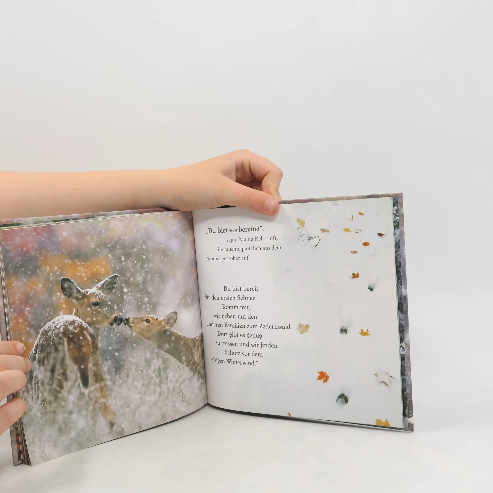 Die Eule bringt eine Nachricht in den herbstlichen Wald: Der Winter kommt früh in diesem Jahr! Unruhe breitet sich aus: Die Vögel ziehen gen Süden. Andere Tiere suchen sich Höhlen für den Winterschlaf. Nur das Kitz fragt sich bang, wie es sich auf den Winter vorbereiten soll. Als der erste Schnee fällt, lauscht es in sich hinein: eine innere Stimme weist ihm den richtigen Weg …