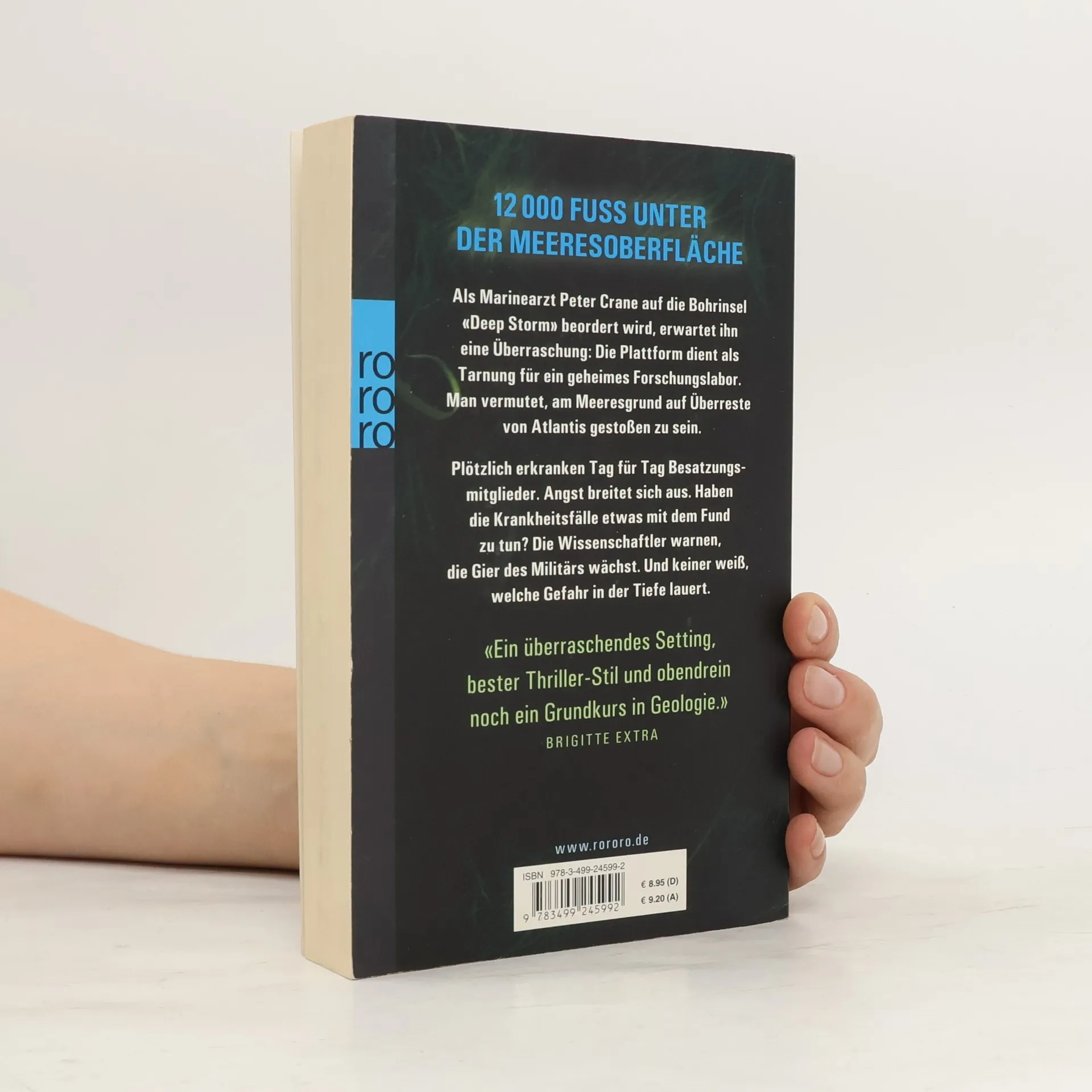 12.000 Fuß unter der Meeresoberfläche. Als Marinearzt Peter Crane auf die Bohrinsel «Deep Storm» beordert wird, erwartet ihn eine Überraschung: Die Plattform dient als Tarnung für ein geheimes Forschungslabor. Man vermutet, am Meeresgrund auf Überreste von Atlantis gestoßen zu sein.Plötzlich erkranken Tag für Tag Besatzungsmitglieder. Angst breitet sich aus. Haben die Krankheitsfälle etwas mit dem Fund zu tun? Die Wissenschaftler warnen, die Gier des Militärs wächst. Und keiner weiß, welche Gefahr in der Tiefe lauert. «Ein überraschendes Setting, bester Thriller-Stil und obendrein noch ein Grundkurs in Geologie.» (Brigitte extra)