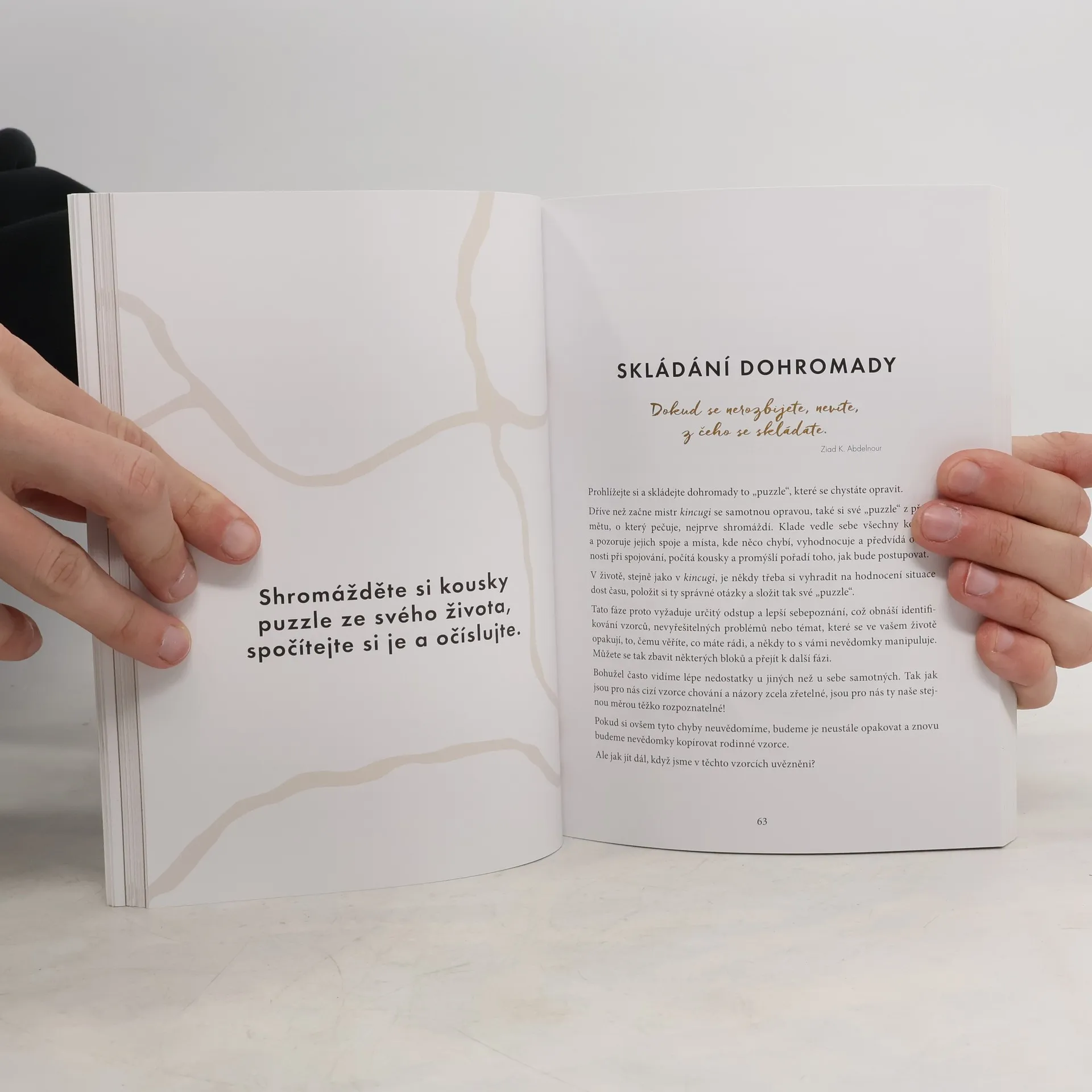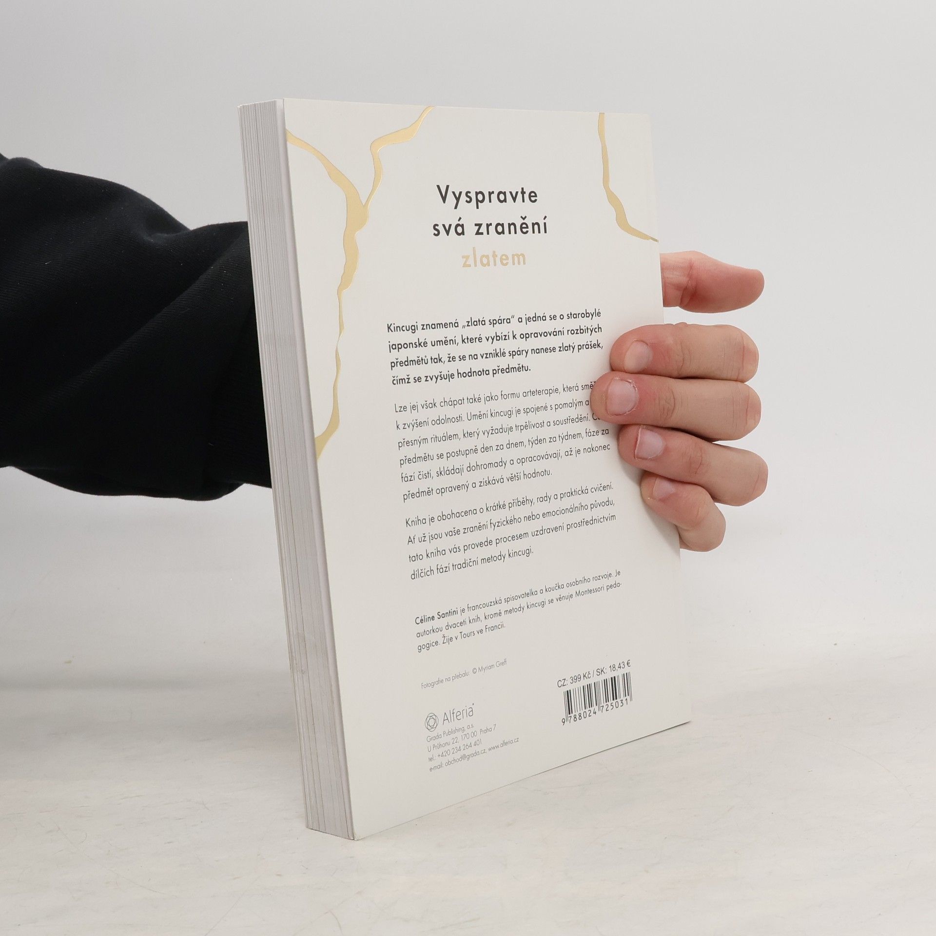 Naučte se přijmout i stinné stránky života, uzdravit nejhlubší zranění a stát se odolnějšími díky této svépomocné knize inspirované starým japonským uměním kincugi. Kincugi je japonský způsob opravy rozbitého porcelánu pomocí práškového zlata. Den po dni, týden po týdnu, krok po kroku se objekt očišťuje, opečovává, opravuje a nakonec obohatí o zlato. Nejde jen o metodu opravy porcelánu, ale stále více rozšířenou terapeutickou metodu využívanou metaforicky i při léčení lidí. „Legenda praví, že šógun Jošimasa Ašikaga (1435–1490) používal během čajového obřadu vždy svou oblíbenou misku (chawan). Jednoho dne se však rozbila. Poslal ji proto do Číny, odkud pocházela, aby ji tam opravili. Z výsledku byl ovšem velmi zklamaný. Po mnoha měsících se mu vrátila miska opravená pomocí ošklivých kovových háčků, které ji nejen hyzdily, ale zároveň nebyly nepropustné. Pověřil proto své japonské umělce, aby našli jiné, efektivnější, a především estetičtější řešení. A tak se zrodilo umění kincugi.“