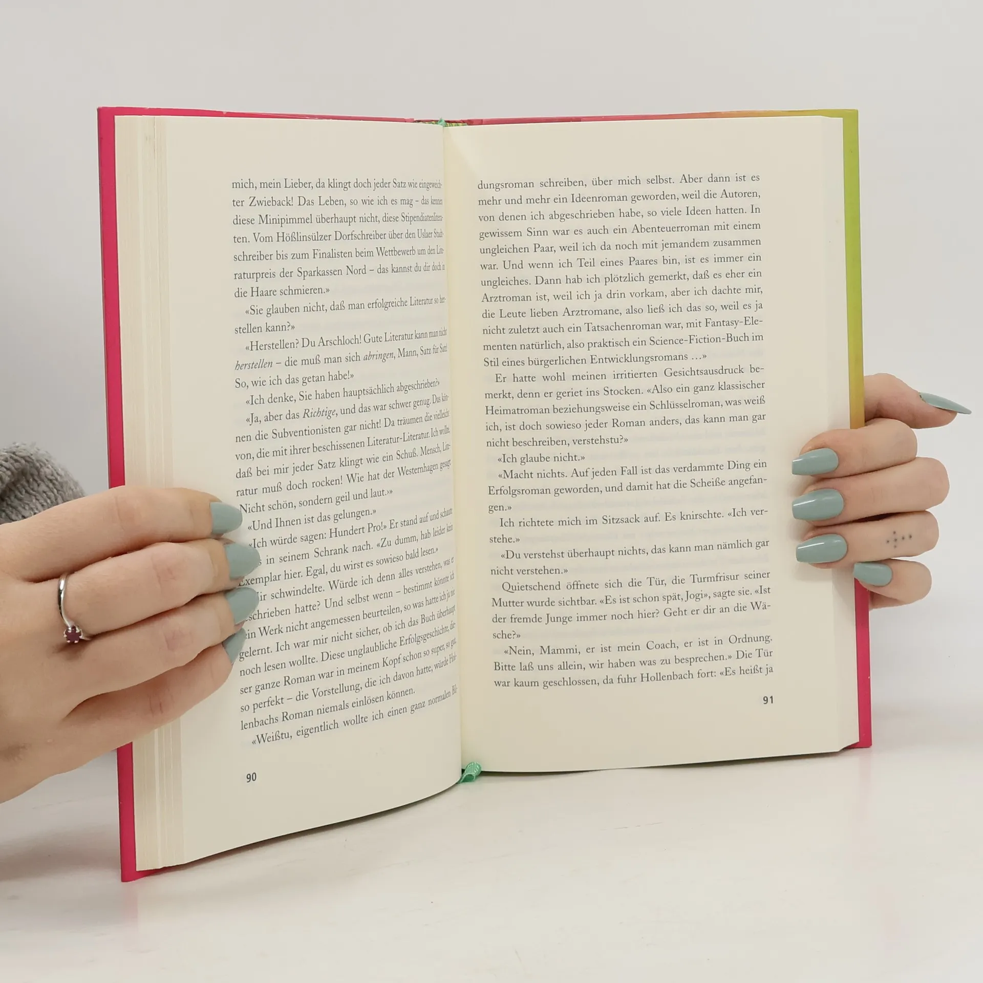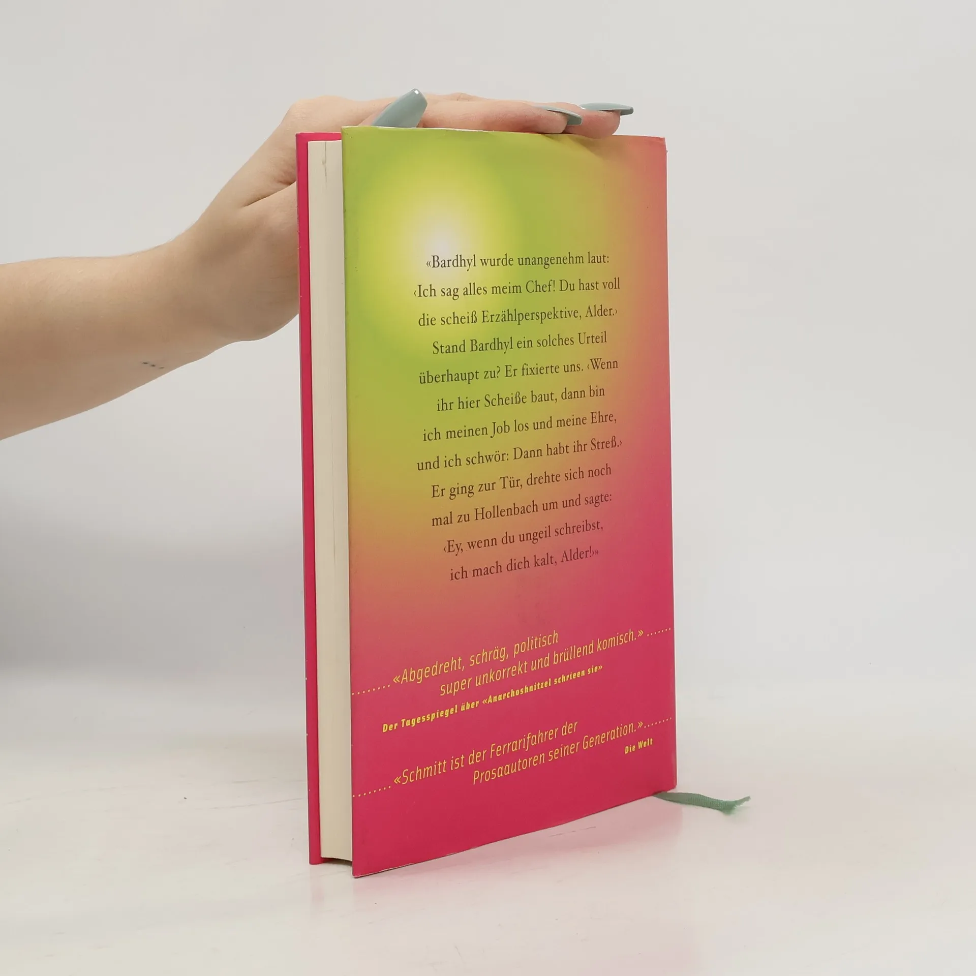 «Bardhyl wurde uangenehm laut: ‹Ich sag alles meim Chef! Du hast voll die scheiß Erzählperspektive, Alder.›Stand Bardhyl ein solches Urteil überhaupt zu? Er fixierte uns. ‹Wenn ihr hier Scheiße baut, dann bin ich meinen Job los und meine Ehre, und ich schwör: Dann habt ihr Streß.›Er ging zur Tür, drehte sich noch mal zu Hollenbach um und sagte: ‹Ey, wenn du ungeil schreibst, ich mach dich kalt, Alder!›»